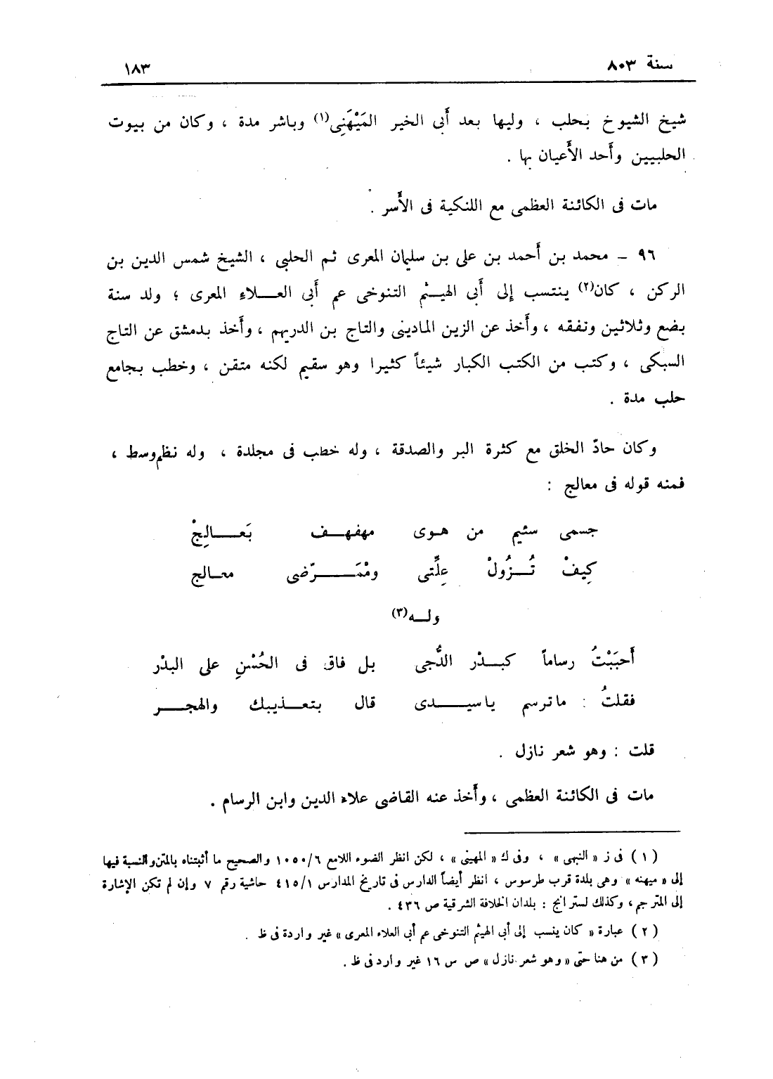 محمد بن أحمد بن علي بن سليمان المعري ثم الحلبي الشيخ شمس الدين ابن الركن كان ينسب إلى أبي الهيثم التنوخي عن ابي العلاء المعري، ولد سنة بضع وثلاثين، وتفقه وأخذ عن الزين الباريني والتاج بن الدريهم، وأخذ بدمشق عن التاج السبكي، وكتب بخطه من الكتب الكبار شيئاً كبيراً وهو ضعيف لكنه متقن، وخطب بجامع حلب مدة، وكان حاد الخلق مع كثرة البر والصدقة، وله خطب في مجلدة أنشأها، وله نظم وسط، فمنه قوله في معالج: