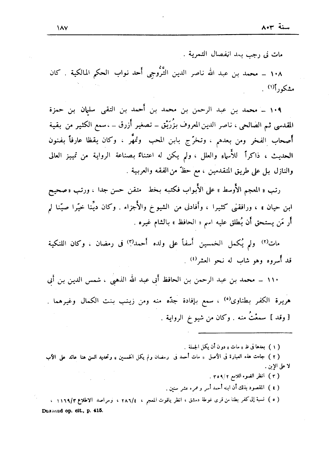 محمد بن عبد الرحمن بن محمد بن احمد بن التقي سليمان بن حمزة المقدسي ثم الصالحي ناصر الدين المعروف بابن زريق تصغير أزرق سمع الكثير من بقية أصحاب الفخر ومن بعدهم تخرج بابن المحب وتمهر وكان يقظاً عارفاً بفنون الحديث ذاكراً للأسماء والعلل ولم يكن له اعتناء بصناعة الرواية من تمييز العالي والنازل بل على طريق المتقدمين مع حظ من الفقه والعربية رتب المعجم الأوسط على الأبواب فكتبه بخط متقن حسن جداً ورتب صحيح ابن حبان ورافقني كثيراً وأفادني من الشيوخ والأجزاء وكان ديناً خيراً صيناً لم أر من يستحق أن يطلق عليه اسم الحافظ بالشام غيره، مات أسفاً على ولده احمد في رمضان ولم يكمل الخمسين وكان اللنكية قد أسروه وهو شاب له نحو العشر.