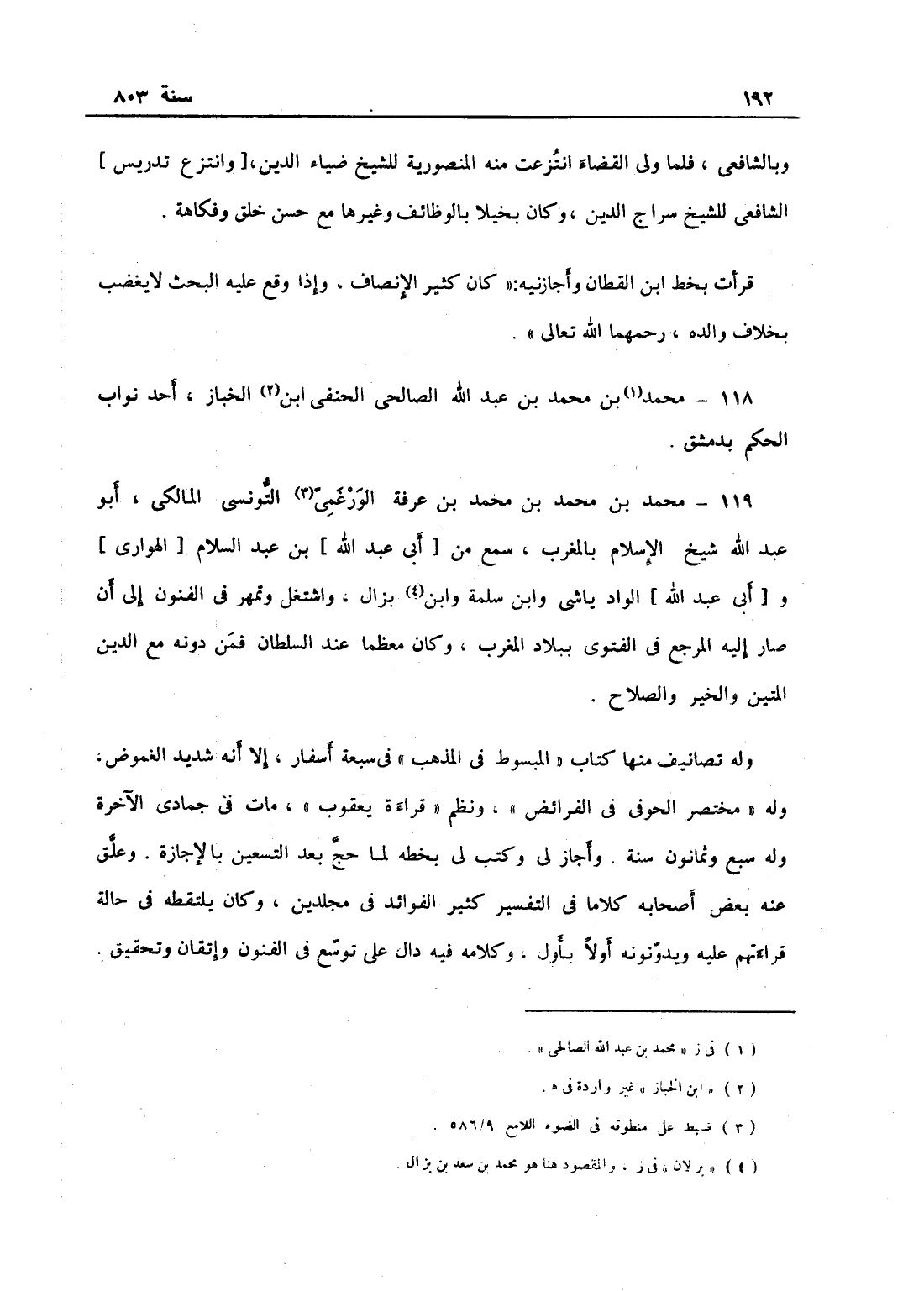 وبالشافعي فلما ولي القضاء انتزعت منه المنصورية للشيخ ضياء الدين والشافعي للشيخ سراج الدين وكان بخيلاُ بالوظائف وغيرها مع حسن خط وفكاهة قرأت بخط ابن القطان وأجازنيه كان كثير الإنصاف وإذا وقع عليه البحث لا يغضب بخلاف والده رحمهما الله تعالى.
