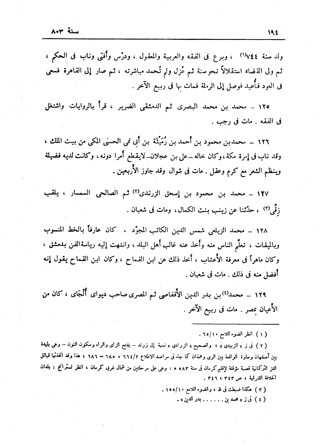 محمد الزيلعي شمس الدين الكاتب المجود، وكان عارفاً بالخط المنسوب وبالميقات، تعلم الناس منه وأخذ عنه غالب أهل البلد، وانتهت إليه رياسة الفن بدمشق، وكان ماهراً في معرفة الأعشاب أخذ ذلك عن ابن القماح، وكان ابن القماح يقول: إنه أفضل منه في ذلك، مات في شعبان.