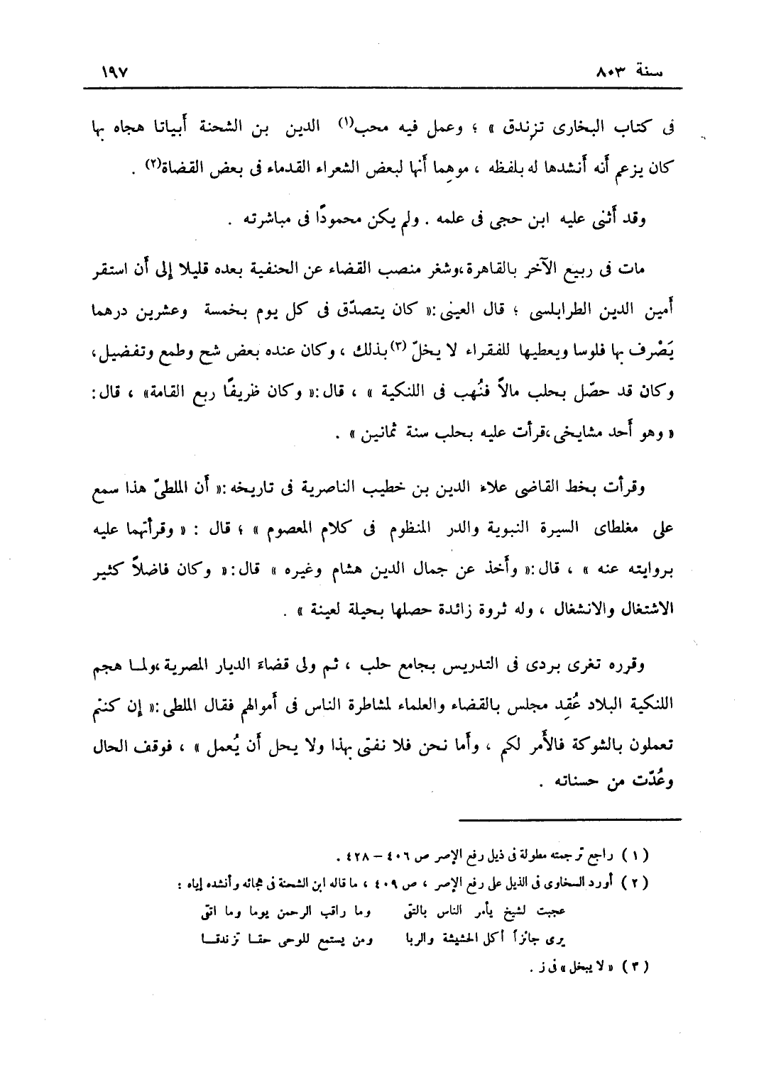 في كتاب البخاري تزندق، وعمل فيه محب الدين ابن الشحنة أبياتاً هجاه بها كان يزعم أن أنشدها له بلفظه موهماً أنها لبعض الشعراء القدماء في بعض القضاة، وقد أثنى عليه ابن حجي في علمه ولم يكن محموداً في مباشرته، مات في ربيع الآخر بالقاهرة وشغر منصب القضاء عن الحنفية بعده قليلاً إلى أن استقر أمين الدين الطرابلسي، قال العيني: كان يتصدق في كل يوم بخمسة وعشرين درهماً يصرف بها فلوساً ويعطيها للفقراء لا يخل بذلك، وكان عنده بعض شح وطمع وتغفيل وكان قد حصل بحلب مالاً كثيراً فنهب في اللنكية، قال: وكان ظريفاً ربع القامة، وقال: وهو أحد مشايخي قرأت عليه بحلب سنة ثمانين وقرأت بخط القاضي علاء الدين ابن خطيب الناصرية في تاريخه أن الملطي هذا سمع من مغلطاي السيرة النبوية والدر المنظوم من كلام المعصوم، قال: وقرأتهما عليه بروايته عنه، قال: وأخذ عن جمال الدين ابن هشام وغيره، قال: وكان فاضلاً كثير الاشتغال والإشغال وله ثروة زائدة حصلها بحيلة العينة وقرره تغري بردى في التدريس بجامع حلب ثم ولي قضاء الديار المصرية ولما هجم اللنكية البلاد عقد مجلس بالقضاء والعلماء لمشاطرة الناس في اموالهم فقال الملطي: إن كنتم تعملون بالشوكة فالأمر لكم وأما نحن فلا نفتي بهذا ولا نحل أن يعمل، فوقف الحال وعدت من حسناته،
