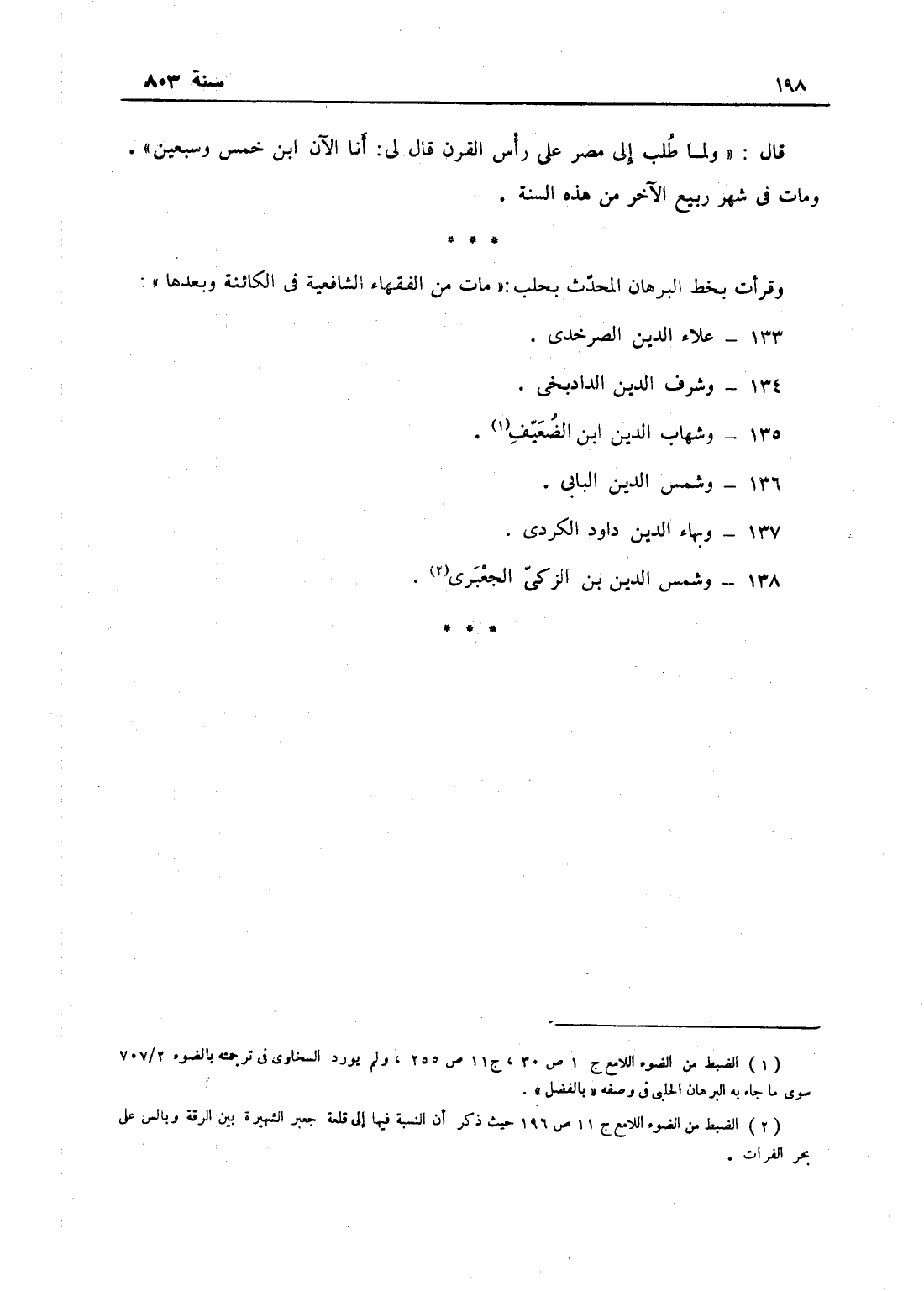قال: ولما طلب إلى مصر على رأس القرن قال: أنا الآن ابن خمس وسبعين، مات في شهر ربيع الآخر من هذه السنة، وقرأت بخط البرهان المحدث بحلب: مات من الفقهاء الشافعية في الكائنة وبعدها في السنة علاء الدين الصرخدي وشرف الدين الدادبخي وشهاب الدين ابن الضعيف وشمس الدين البابي وبهاء الدين داود الكردي وشمس الدين ابن الزكي الجعبري.