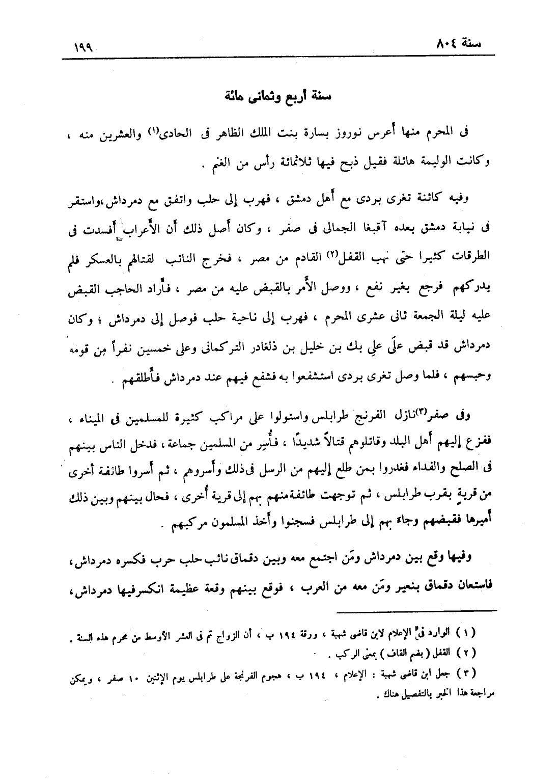 وفيها وقع دمرداش ومن اجتمع معه وبين دقماق نائب حلب حرب فكسره دمرداش فاستعان دقماق بنعير ومن معه من العرب فوقع بينهم وقعة عظيمة انكسر فيها دمرداش