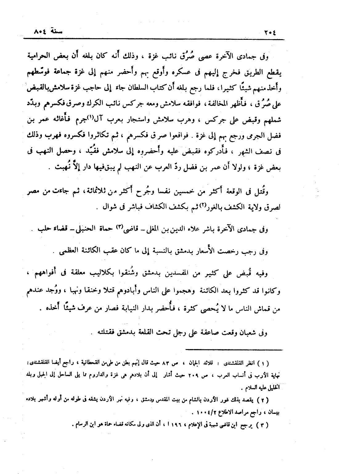 وفيه قبض على كثير من المفسدين بدمشق وشنقوا بكلاليب معلقة في أفواههم وكانوا قد كثروا بعد الكائنة وهجموا على الناس وأبادوهم قتلاً وخنقاً ونهباً ووجد عندهم من قماش الناس ما لا يحصى كثرة فأحضر بدار النيابة فصار من عرف شيئاً أخذه.