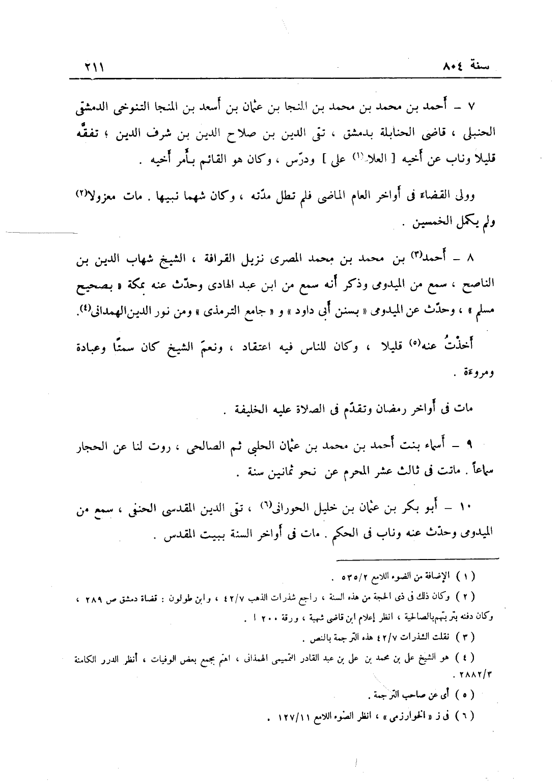 أحمد بن محمّد بن محمّد بن المنجا بن عثمان بن أسعد بن المنجا التنوخي الدمشقي الحنبلي قاضي الحنابلة بدمشق تقي الدين ابن صلاح الدين ابن شرف الدين تفقه قليلاً وناب عن أخيه ودرس وكان هو القائم بأمر أخيه وولي القضاء في أواخر العام الماضي فلم تطل مدته وكان شهماً نبيهاً؛ مات معزولاً ولم يكمل الخمسين.