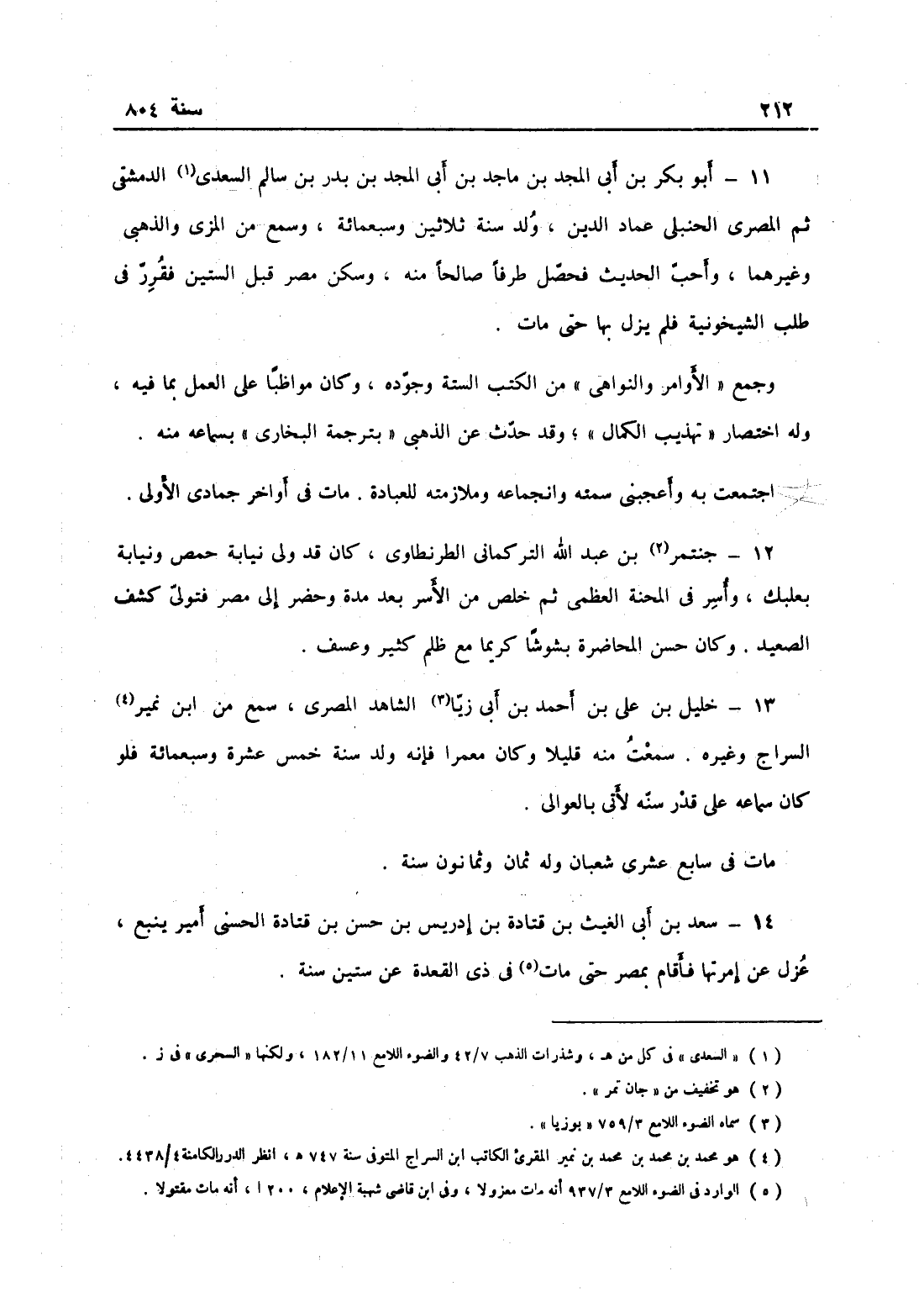 أبو بكر بن أبي المجد بن ماجد بن أبي المجد بن بدر بن سالم السعدي الدمشقي ثم المصري الحنبلي عماد الدين، ولد سنة ثلاثين وسبعمائة وسمع من المزي والذهبي وغيرهما وأحب الحديث فحصل طرفاً صالحاً منه، وسكن مصر قبل الستين فقرر في طلب الشيخونية فلم يزل بها حتى مات، وجمع الأوامر والنواهي من الكتب الستة وجوده وكان مواظباً على العمل بما فيه، وله اختصار تهذيب الكمال، وقد حدث عن الذهبي بترجمة البخاري بسماعه منه، اجتمعت به وأعجبني سمته وانجماعه وملازمته للعبادة، مات في آخر جمادى الأولى جنتمر بن عبد الله التركماني الطرنطاي، كان قد ولي نيابة حمص ونيابة بعلبك وأسر في المحنة العظمى ثم خلص من الأسر بعد مدة وحضر إلى مصر فتولى كشف الصعيد، وكان حسن المحاضرة بشوشاً كريماً مع ظلم كثير وعسف.