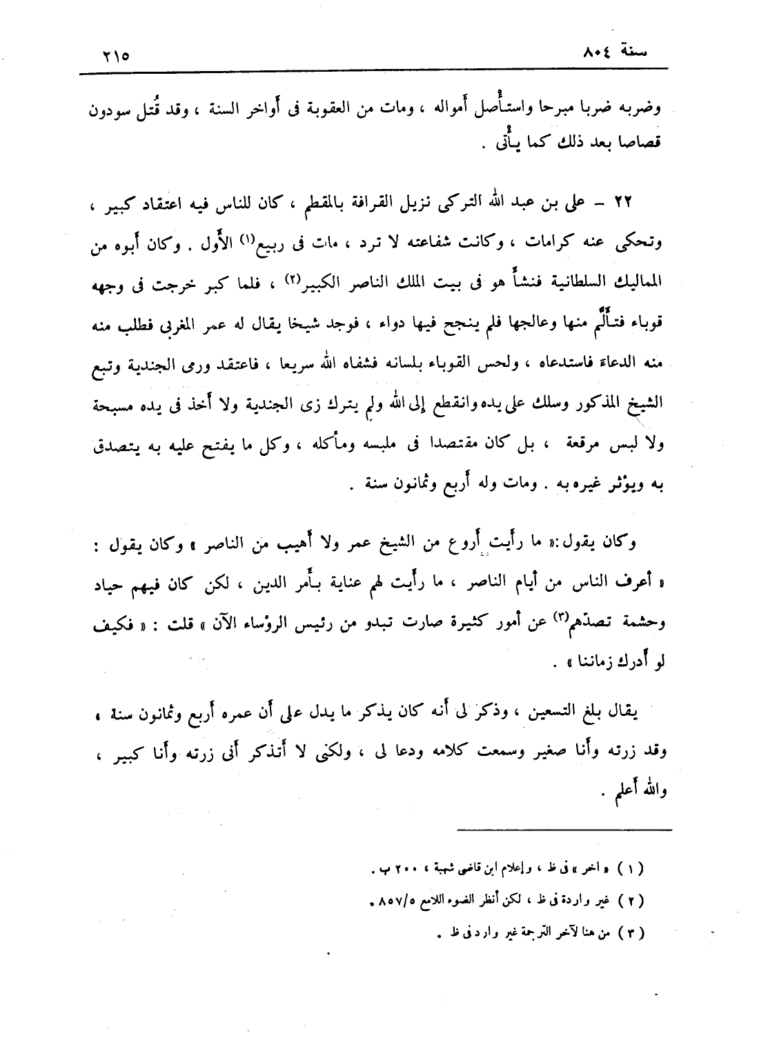 علي بن عبد الله التركي نزيل القرافة بالجبل المقطم كان للناس فيه اعتقاد كثير ويحكى عنه كرامات وكانت شفاعته لا ترد مات في ربيع الأول، وكان أبوه من المماليك السلطانية فنشأ هو في بيت الملك الناصر الكبير، فلما كبر خرجت في وجهه قوبا فتألم منها وعالجها فلم ينجع فيها دواء فوجد شيخاً يقال له عمر المغربي فطلب منه الدعاء فاستدناه ولحس القوبا بلسانه فشفاه الله سريعاً فاعتقده ورمى الجندية وتبع الشيخ المذكور وتسلك على يديه وانقطع إلى الله ولم يترك زي الجندية ولا أخذ في يده سبحة ولا لبس مرقعه بل كان مقتصداً في ملبسه ومأكله وكلما يفتح عليه يتصدق به ويؤثر غيره، ومات وله أربع وثمانون سنة، وكان يقول: ما رأيت أورع من الشيخ عمر ولا أهيب من الناصر، وكان يقول: أعرف الناس من أيام الناصر، ما رأيت لهم عناية بأمر الدين لكن كان فيهم حياء وحشمة تصدهم عن أمور كثيرة صارت تبدو من رئيس الرؤساء الآن، قلت: فكيف لو أدرك زماننا! يقال بلغ التسعين، وذكر لي أنه كان يذكر ما يدل على أن عمره أربع وثمانون سنة، وقد زرته وأنا صغير وسمعت كلامه ودعا لي ولكني لا أتذكر أني زرته وأنا كبير فالله أعلم.
