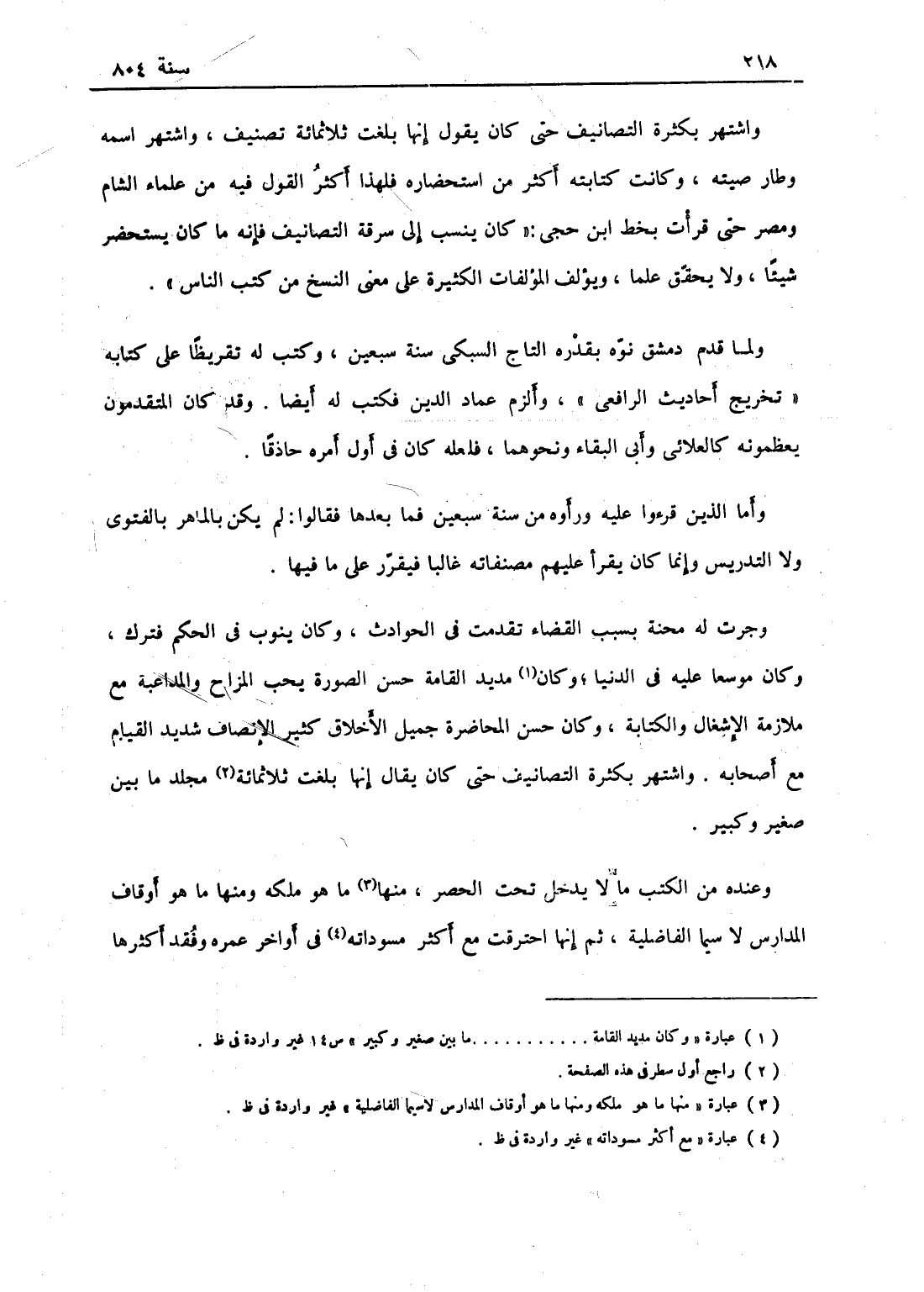 واشتهر بكثرة التصانيف حتى كان يقول إنها بلغت ثلاثمائة تصنيفاً واشتهر اسمه وطار صيته، وكانت كتابته أكثر من استحضاره فلهذا كثر القول فيه من علماء الشام ومصر حتى قرأت بخط ابن حجي كان ينسب إلى سرقة التصانيف فإنه ما كان يستحضر شيئاً ولا يحقق علماً ويؤلف المؤلفات الكثيرة على معنى النسخ من كتب الناس، ولما قدم دمشق نوه بقدرة تاج الدين السبكي سنة سبعين وكتب له تقريظاً على كتابه تخريج أحاديث الرافعي وألزم عماد الدين ابن كثير فكتب له أيضاً، وقد كان المتقدمون يعظمونه كالعلائي وأبي البقاء ونحوهما فلعله كان في أول أمره حاذقاً، وأما الذين قرؤا عليه ورأوه من سنة سبعين فما بعدها فقالوا: لم يكن بالماهر في الفتوى ولا التدريس وإنما كان يقرأ عليه مصنفاته غالباً فيقرر على ما فيها، وجرت له محنة بسبب القضاء تقدمت في الحوادث وكان ينوب في الحكم فترك، وكان موسعاً عليه في الدنيا وكان مديد القامة، حسن الصورة، يحب المزاح والمداعبة مع ملازمة الاشتغال والكتابة، وكان حسن المحاضرة جميل الأخلاق كثير الإنصاف شديد القيام مع أصحابه، واشتهر بكثرة التصانيف حتى كان يقال إنها بلغت ثلاثمائة مجلدة ما بين كبير وصغير. وعنده من الكتب ما لا يدخل تحت الحصر منها ما هو ملكه ومنها ما هو من أوقاف المدارس لا سيما الفاضلية، ثم إنها احترقت مع أكثر مسوداته في أواخر عمره ففقد أكثرها،