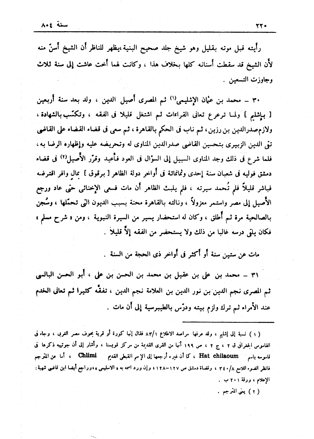 محمّد بن عثمان الأشليمي ثم المصري أصيل الدين ولد بعد سنة أربعين، ولما ترعرع تعانى القرآن، ثم اشتغل قليلاً في الفقه وتكسب بالشهادة ولازم صدر الدين ابن رزين ثم ناب في الحكم بالقاهرة ثم سعى في قضاء القضاة على القاضي تقي الدين الزبيري بتحسين القاضي صدر الدين المناوي له ذلك وتحريضه عليه وإظهاره الرضا به، فلما شرع في ذلك وجد المناوي السبيل إلى السؤال في العود فأعيد وقرر الأصيل في قضاء دمشق، فوليه في شعبان سنة إحدى وثمانمائة في أواخر دولة الظاهر بمال اقترضه وافر فباشر قليلاً فلم تحمد سيرته، فلم يلبث الظاهر أن مات فسعى الأخناي حتى عاد ورجع الأصيل إلى مصر واستمر معزولاً، ونالته بالقاهرة محنة بسبب الديون التي تحملها وسجن بالصالحية مدة ثم أطلق، وكان له استحضار يسير من السيرة النبوية ومن شرح مسلم فكان يلقي درسه غالباً من ذلك ولا يستحضر من الفقه إلا قليلاً، مات عن ستين سنة أو أكثر في أواخر ذي الحجة من السنة.