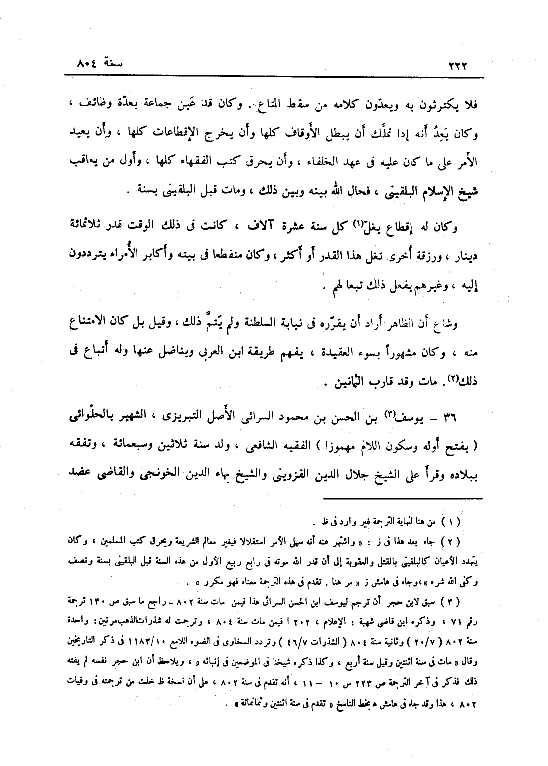 فلا يكترثون به ويعدون كلامه من سقط المتاع، وكان قد عين جماعة لعدة وظائف وكان يعد أنه إذا تملك أن يبطل الأوقاف كلها، وأن يخرج الإقطاعات كلها، وأن يعيد الأمر إلى ما كان عليه في عهد الخلفاء، وأن يحرق كتب الفقهاء كلها، وأول من يعاقب شيخ الإسلام البلقيني، فحال الله بينه وبين ذلك، ومات قبل البلقيني بسنة، وكان له إقطاع تغل في كل سنة عشرة آلاف كانت في ذلك الوقت قدر ثلاثمائة دينار ورزقة أخرى تغل هذا القدر أو أكثر منه، وكان منقطعاً في بيته وأكابر الأمراء يترددون إليه وغيرهم يفعل ذلك تبعاً لهم، وشاع أن الظاهر أراد أن يقرره في نيابة السلطنة ولم يتم ذلك، وقيل: بل كان الامتناع منه، وكان مشهوراً بسوء العقيدة يفهم طريق ابن العربي ويناضل عنها وله أتباع في ذلك، واشتهر عنه أنه سيلي الأمر استقلالاً فيغير معالم الشريعة ويحرق كتب المسلمين، وكان يتهدد الأعيان كالبلقيني بالقتل والعقوبة إلى أن قدر الله موته في رابع ربيع الأول من هذه السنة قبل البلقيني بسنة ونصف وكفى الله شره وكان قد قارب الثمانين أو جاوزها.