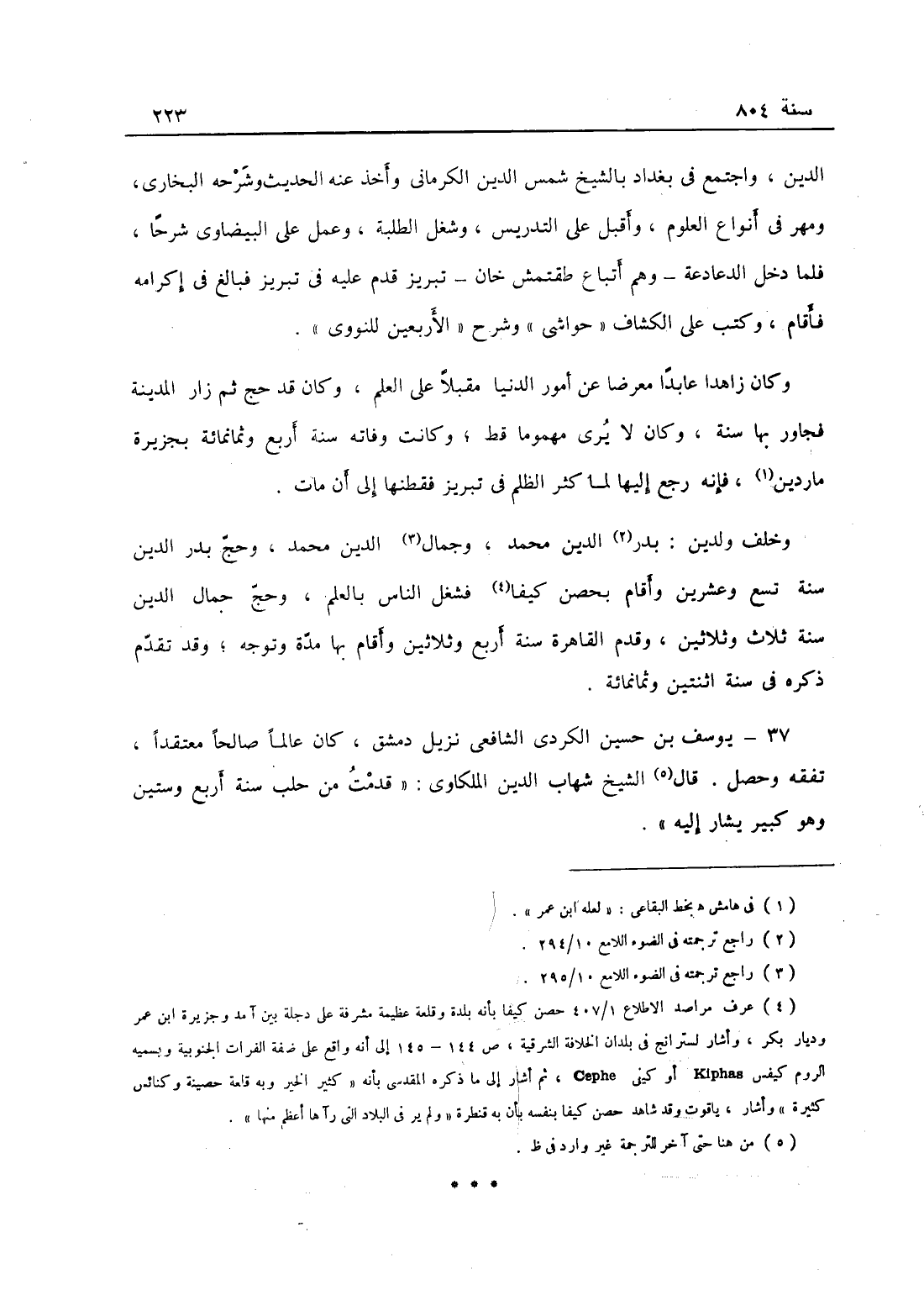 الدين، واجتمع في بغداد بالشيخ شمس الدين الكرماني وأخذ عنه الحديث وشرحه للبخاري ومهر في أنواع العلوم، وأقبل على التدريس وشغل الطلبة، وعمل على البيضاوي شرحاً، فلما دخل الدعادعة وهم أتباع طقتمش خان تبريز وخربوها تحول الشيخ عز الدين إلى ماردين فأقام بها مدة، ثم راسله مرزا ابن اللنك فقدم عليه تبريز فبالغ في إكرامه فأقام بها، وكتب على الكشاف حواشي وشرح الأربعين للنووي، وكان زاهداً عابداً معرضاً عن أمور الدنيا مقبلاً على العم، وكان قد حج ثم زار المدينة فجاور بها سنة وكان لا يرى مهموماً قط، وكانت وفاته سنة أربع وثمانمائة بالجزيرة فإنه رجع إليها لما كثر الظلم في تبريز فقطنها إلى أن مات، وخلف ولدين بدر الدين محمّدا وجمال الدين محمدا، وحج بدر الدين سنة تسع وعشرين وأقام بحصن كيفا فشغل الناس بالعلم، وحج جمال الدين سنة ثلاث وثلاثين، وقدم القاهرة سنة أربع وثلاثين وأقام بها مدة وتوجه وقد تقدم ذكره في سنة اثنتين وثمانمائة.