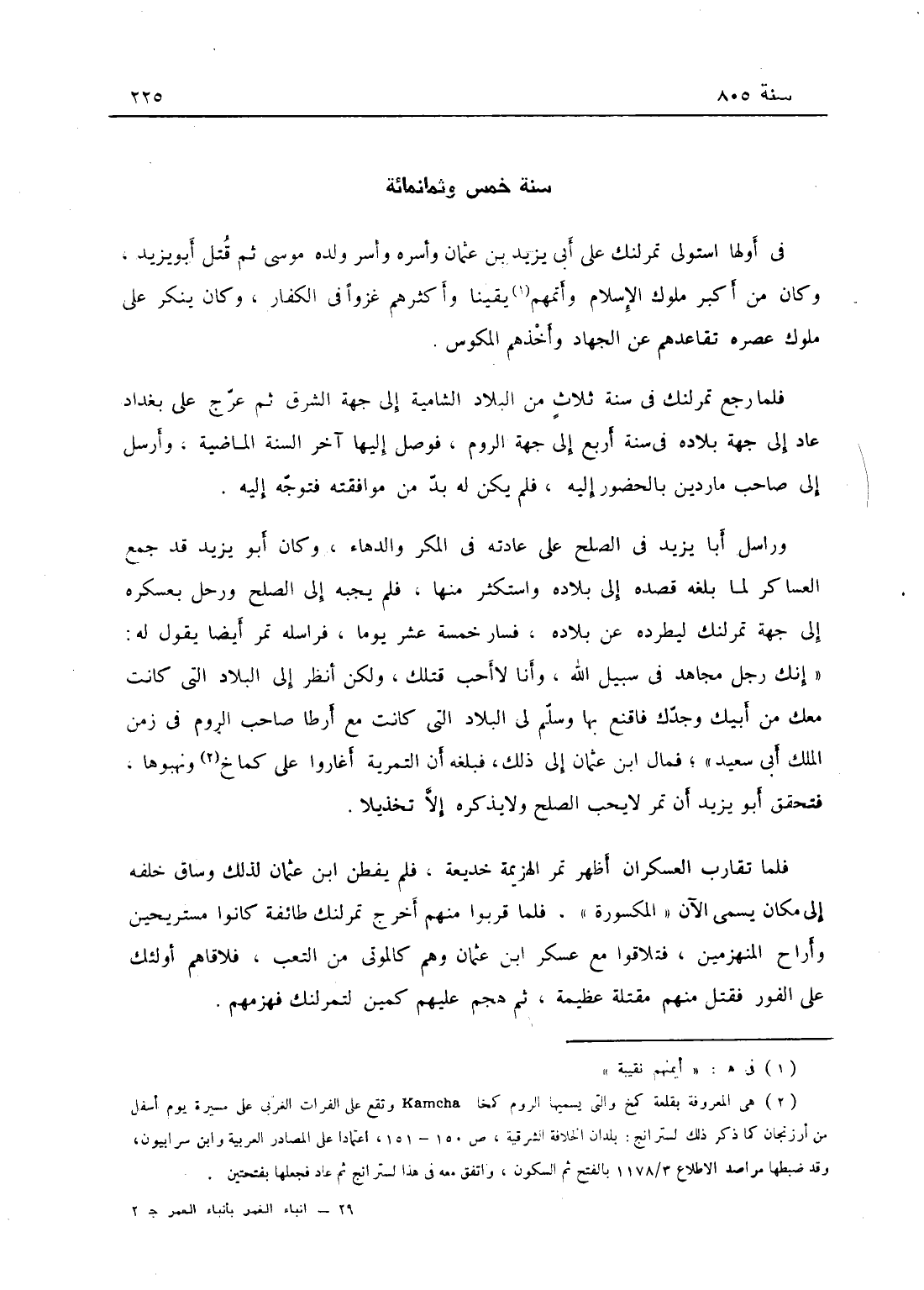في أولها استولى اللنك على أبي يزيد ابن عثمان وأسره وأسر ولده موسى ثم قتل أبو يزيد، وكان من أكبر ملوك الإسلام وأيمنهم نقيبة وأكثرهم غزواً في الكفار، وكان ينكر على ملوك عصره تقاعدهم عن الجهاد وأخذهم المكوس فلما رجع تمرلنك في سنة ثلاث من البلاد الشامية إلى جهة الشرق ثم عرج على بغداد عاد إلى جهة الروم فوصل إليها في أواخر السنة الماضية وأرسل إلى صاحب ماردين يأمره بالحضور إليه فلم يكن له بد من موافقته فتوجه إليه وراسل أبا يزيد في الصلح على عادته في المكر والدهاء، وكان أبو يزيد قد جمع العساكر لما بلغه قصده إلى بلاده واستكثر فيها فلم يجبه إلى الصلح ورحل بعسكره إلى جهة تمرلنك ليطرده عن بلاده فسار خمسة عشر يوماً فراسله تمر أيضاً يقول له إنك رجل مجاهد في سبيل الله وأنا لا أحب قتلك ولكن انظر إلى البلاد التي كانت معك من أبيك وجدك فاقنع بها وسلم لي البلاد التي كانت مع أرطنا صاحب الروم في زمن الملك أبي سعيد، فمال ابن عثمان إلى ذلك، فبلغه أن التمرية أغاروا على كماخ ونهبوها فتحقق أبو يزيد أن تمر لا يحب الصلح ولا يذكره إلا تخذيلاً، فلما تقارب العسكران أظهر تمر الهزيمة خديعة فلم يفطن ابن عثمان لذلك وساق خلفه إلى مكان يسمى الآن المكسورة فلما قربوا منهم أخرج تمرلنك طائفة كانوا مستريحين وأراح المنهزمين فتلاقوا مع عسكر ابن عثمان وهم كالموتى من التعب، فلاقاهم أولئك على الفور فقتل منهم مقتلة عظيمة، ثم هجم عليهم كمين لتمرلنك فهزمهم،