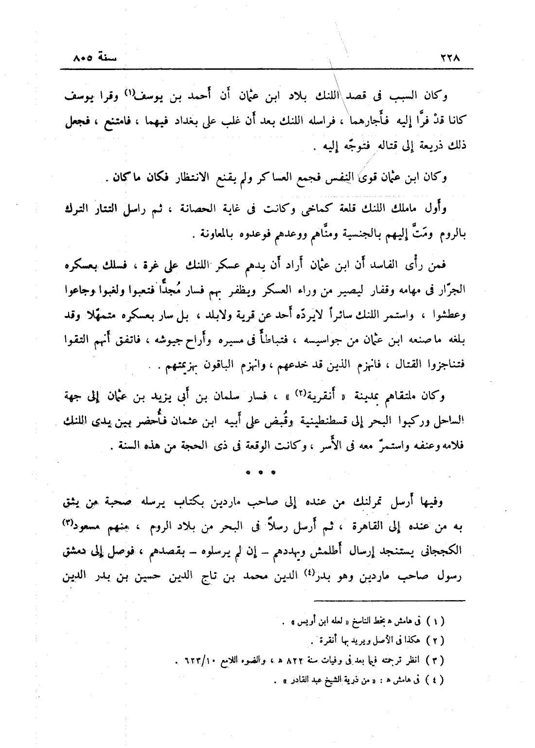 وأول ما ملك اللنك قلعة كماخي وكانت في غاية الحصانة ثم راسل التتار الترك بالروم ومتّ إليهم بالجنسية ومنّاهم ووعدهم فوعدوه بالمعاونة، فمن الرأي الفاسد أن ابن عثمان أراد أن يدهم عسكر اللنك على غرة، فسلك بعسكره الجرار في مهامه وقفار ليصير من وراء العسكر ويظفر بهم فسار مجداً فتعبوا ولغبوا وجاعوا وعطشوا واستمر اللنك سائراً لا يرده أحد عن قرية ولا بلد بل سار بعسكره متمهلاً وقد بلغه ما صنعه ابن عثمان من جواسيسه فتباطأ في سيره وأراح جيوشه، فاتفق أنهم التقوا فتناجزوا القتال فانهزم التتار الذين كان قد خدعهم وانهزم الباقون بهزيمتهم، وكان ملتقاهم بمدينة أنقرة، فسار سليمان بن أبي يزيد بن عثمان بمن معه إلى جهة الساحل وركبوا البحر إلى القسطنطينية، وقبض على أبيه ابن عثمان فأحضر بين يدي اللنك فلامه وعنفه واستمر معه في الأسر وكانت الوقعة في ذي الحجة من هذه السنة.