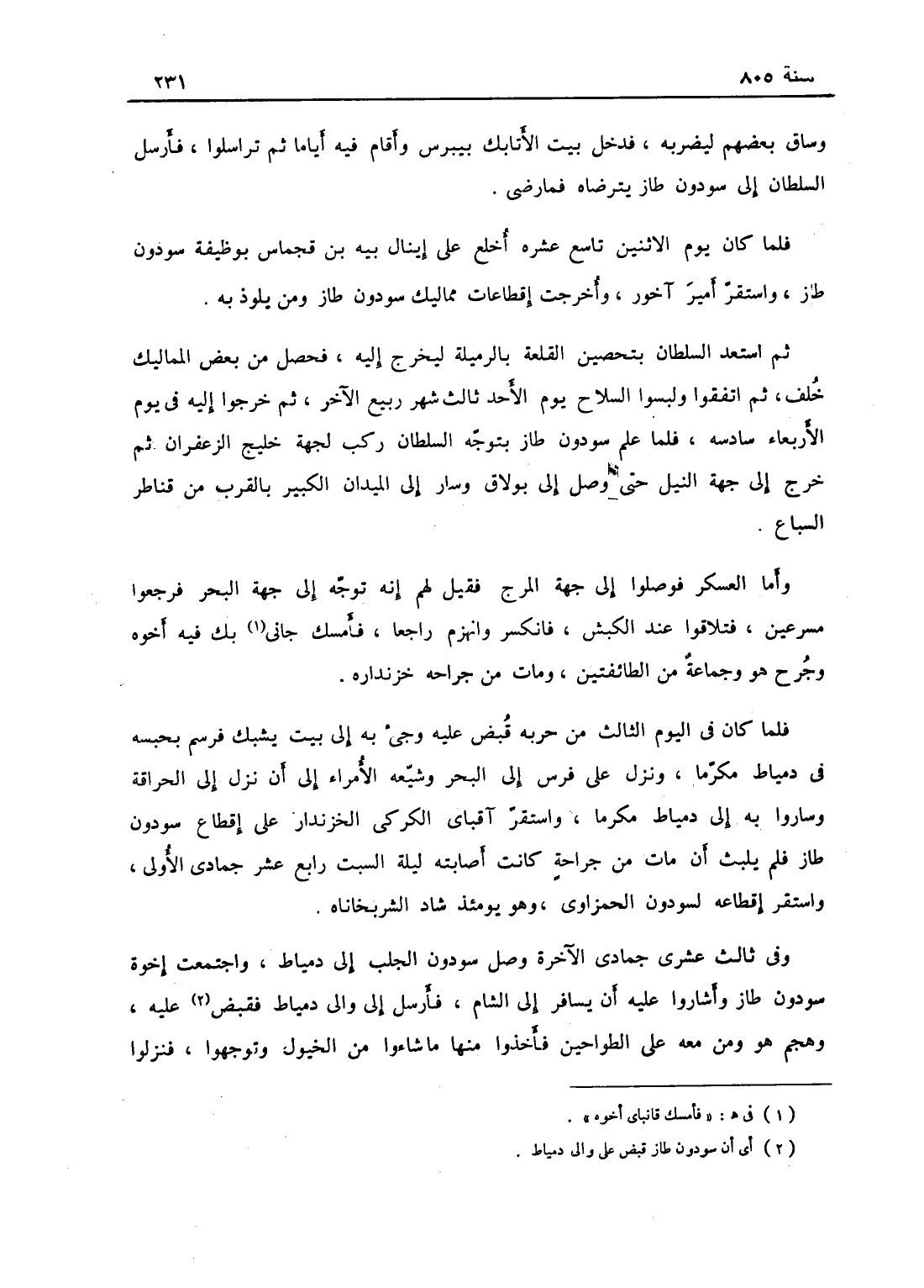 وساق بعضهم ليضربه فدخل بيت الأتابك بيبرس وأقام فيه أياماً ثم تراسلوا فأرسل السلطان إلى سودون طاز يترضاه فما رضي فلما كان يوم الاثنين تاسع عشره خلع على إينال باي بن قجماس بوظيفة سودون طاز واستقر أمير آخور وأخرجت إقطاعات مماليك سودون طاز ومن يلوذ به ثم استعد السلطان لتحصين القلعة بالرماة ليخرج إليه فحصل بين بعض المماليك خلف، ثم اتفقوا ولبسوا السلاح يوم الأحد ثالث شهر ربيع الآخر ثم خرجوا إليه في يوم الأربعاء سادسه فلما علم سودون طاز بتوجه السلطان ركب لجهة خليج الزعفران ثم خرج إلى جهة النيل حتى وصل إلى بولاق وسار إلى الميدان الكبير بالقرب من قناطر السباع، وأما العسكر فوصلوا إلى جهة المرج فقيل لهم إنه توجه إلى جهة البحر فرجعوا مسرعين فتلاقوا عند الكبش فانكسر وانهزم راجعاً فأمسك قانباي أخوه وجرح هو وجماعة من الطائفتين ومات من جراحه خازنداره فلما كان في اليوم الثالث من حربه قبض عليه وجيء به إلى بيت يشبك فرسم بحبسه في دمياط مكرماً ونزل على فرس إلى البحر وشيعه الأمراء إلى نزل إلى الحراقة وساروا به إلى دمياط مكرماً واستقر آقباي الكركي الخازندار على إقطاع سودون طاز فلم يلبث أن مات من جراحة كانت أصابته ليلة السبت رابع عشر جمادى الأولى، واستقر إقطاعه لسودون الحمزاوي وهو يومئذٍ شاد الشربخاناه.