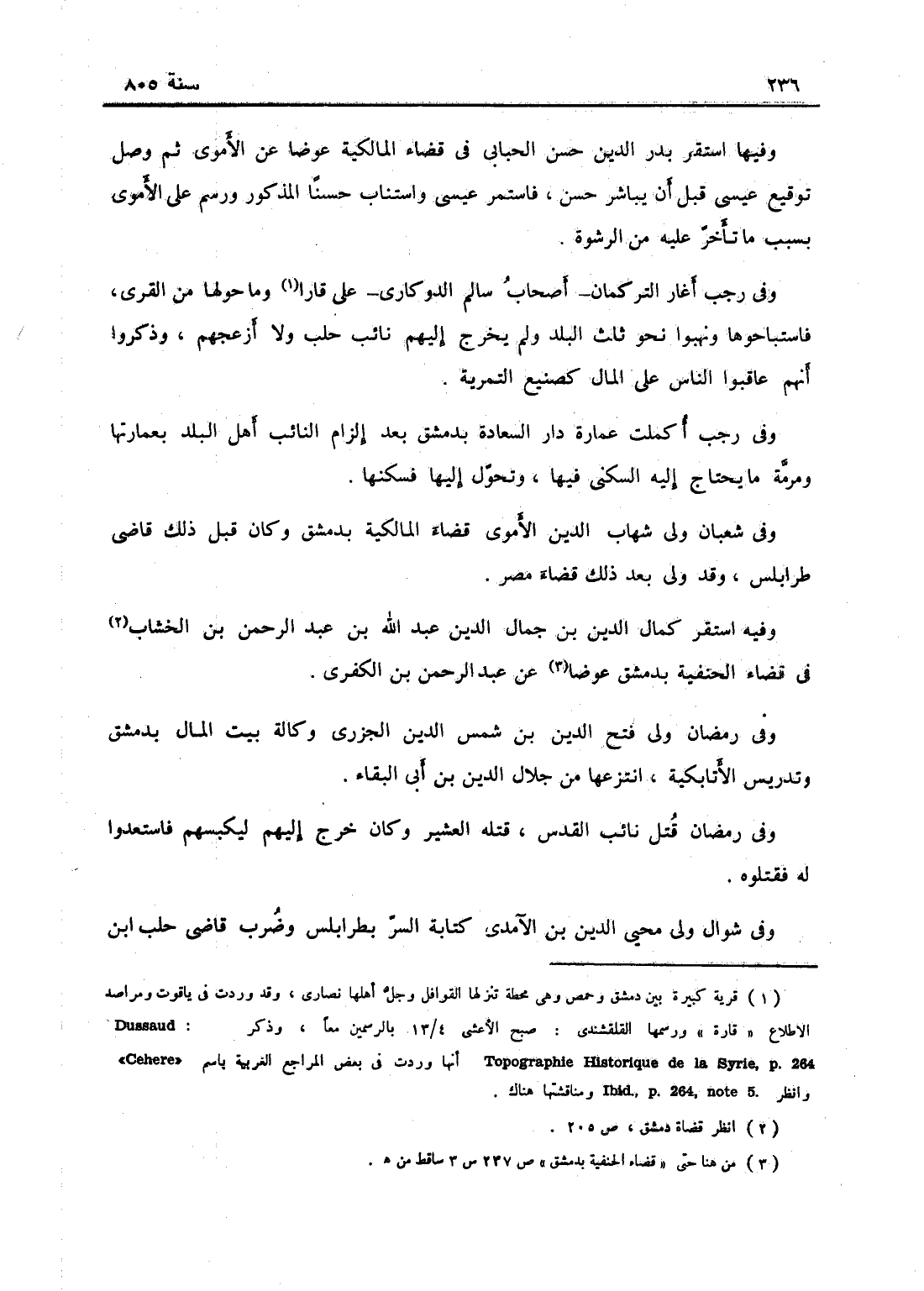 وفيها استقر بدر الدين حسن الجابي في قضاء المالكية عوضاً عن الأُموي، ثم وصل توقيع عيسى قبل أن يباشر حسن فاستمر عيسى واستناب حسناً المذكور ورسم على الأموي بسبب ما تأخر عليه من الرشوة.