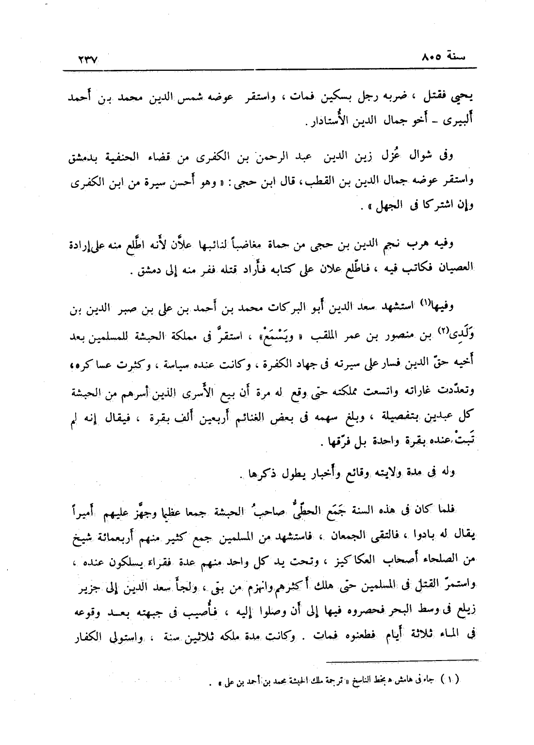 وفيها استشهد سعد الدين أبو البركات محمد بن أحمد بن علي، بن كذا، بن صير الدين بن ولوى بن منصور بن عمر الملقب ولسمع، استقر في مملكة الحبشة للمسلمين بعد أخيه حق الدين، فسار على سيرته في جهاد الكفرة وكانت عنده سياسة وكثرت عساكره وتعددت غاراته واتسعت مملكته حتى وقع له مرة أن يبيع الأسرى الذين أسرهم من الحبشة كل عبدين بتفصيلة، وبلغ سهمه من بعض الغنائم أربعين ألف بقرة فيقال إنه لم تبت عنده بقرة واحدة بل فرّقها، وله في مدة ولايته وقائع وأخبار يطول ذكرها، فلما كان في هذه السنة جمع الحطى صاحب الحبشة جمعاً عظيماً وجهز عليهم أميراً يقال له باروا فالتقى الجمعان فاستشهد من المسلمين جمع كثير منهم أربعمائة شيخ من الصلحاء أصحاب العكاكيز، وتحت يد كل واحد منهم عدة فقراء مسلكون عنده، واستحر القتل في المسلمين حتى هلك أكثرهم وانهزم من بقي، ولجأ سعد الدين إلى جزيرة زيلع في وسط البحر، فحصروه فيها إلى أن وصلوا إليه، فأصيب في جبهته بعد وقوفه في الماء ثلاثة أيام فطعنوه فمات، وكانت مدة ملكه ثلاثين سنة، واستولى الكفار