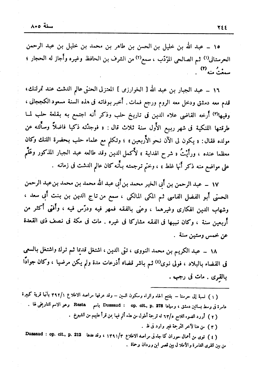 وفيها أرخه القاضي علاء الدين في تاريخ حلب وذكر أنه اجتمع به بقلعة حلب لما طرقتها اللنكية في شهر ربيع الأول سنة ثلاث، قال: فوجدته ذكيّاً فاضلاً، وسألته عن مولده فقال: يكون لي الآن نحو الأربعين، وتكلم مع علماء حلب بحضرة اللنك وكان معظماً عنده، ورأيت شرح الهداية لأكمل الدين وقد طالعه عبد الجبار المذكور وعلّم على مواضع منه وذكر أنها غلط، وختم ترجمته بأنه كان عالم الدشت في زمانه.