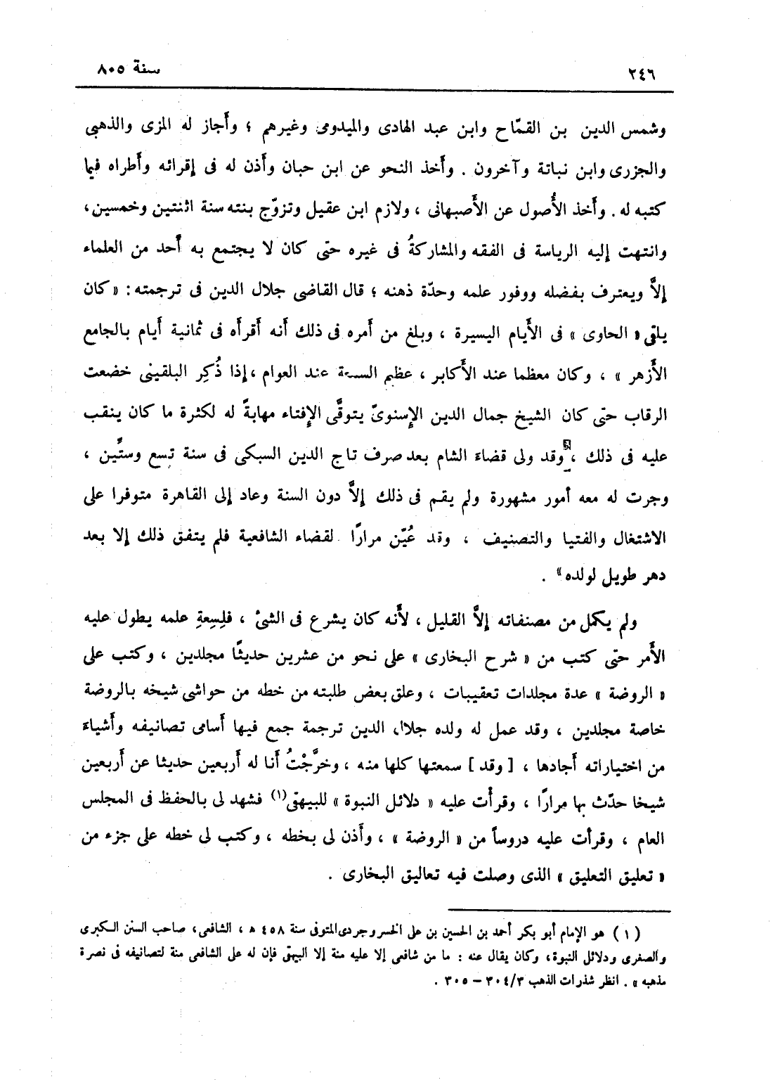 وشمس الدين بن القماح وابن عبد الهادي والميدومي وغيرهم، وأجاز له الذهبي والمزي والجزري وابن نباتة وآخرون، وأخذ النحو عن أبي حيان، وأذن له في إقرائه وأطراه فيما كتبه له، وأخذ الأصول عن الأصبهاني، ولازم ابن عقيل وتزوج بنته سنة اثنتين وخمسين، وانتهت إليه الرياسة في الفقه والمشاركة في غيره حتى كان لا يجتمع به أحد من العلماء إلا ويعترف بفضله ووفور علمه وحدة ذهنه، قال القاضي جلال الدين في ترجمته كان يلقى الحاوي في الأيام اليسيرة وبلغ من أمره في ذلك أن أقرأه في ثمانية أيام بالجامع الأزهر، وكان معظّماً عند الأكابر عظيم السمعة عند العوام، إذا ذكر البلقيني خضعت الرقاب حتى كان الشيخ جمال الدين الأسنوي يتوقّى الإفتاء مهابة له لكثرة ما كان ينقب عليه في ذلك، وقد ولي قضاء الشام بعد صرف تاج الدين السبكي في سنة تسع وستين، وجرت له معه أمور مشهورة ولم يقم في ذلك إلا دون السنة وعاد إلى القاهرة متوفراً على الاشتغال والإفتاء والتصنيف، وقد عيّن مرّات لقضاء الشافعية فلم يتفق ذلك إلاّ بعد دهر طويل لولده، ولم يكمل من مصنفاته إلا القليل لأنه كان يشرع في الشيء فلسعة علمه يطول عليه الأمر، حتى كتب من شرح البخاري على نحو من عشرين حديثاً مجلّدين، وكتب على الروضة عدة مجلدات تعقبات وعلق بعض طلبته من خطه من حواشي نسخته باروضة خاصة مجلدين، وقد عمل له ولده جلال الدين ترجمة جمع فيها أسامي تصانيفه وأشياء من اختياراته أجادها، سمعتها كلها منه، وخرجت أنا له أربعين حديثاً عن أربعين شيخاً، حدّثت بها مراراً، وقرأت عليه دلائل النبوّة للبيهقي فشهد لي بالحفظ في المجلس العام، وقرأت عليه دروساً من الروضة، وأذن لي بخطه وكتب لي بخطه على جزء من تعليق التعليق الذي وصلت فيه تعاليق البخاري،