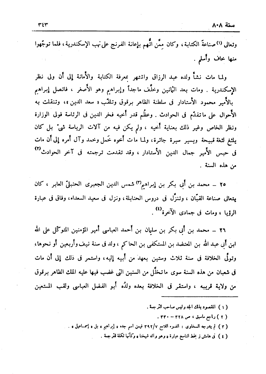 يتعانى صناعة الكتابة، فكان ممن اتهم بإعانة الفرنج على نهب الإسكندرية، فلما توجهوا عنها خاف فأسلم، ولما مات نشأ ولده عبد الرزاق واشتهر بمعرفة الكتابة والأمانة إلى أن ولي نظر الإسكندرية، ومات بعد الثمانين وخلف ماجداً وإبراهيم وهو الأصغر، فاتصل إبراهيم بالأمير محمود الأستادار في سلطنة الظاهر برقوق وتلقب سعد الدين، وتنقلت به الأحوال على ما تقدم في الحوادث، وعظم قدر أخيه فخر الدين في الرياسة، وولي الوزارة ونظر الخاص وغير ذلك، كل ذلك بعناية أخيه، ولم يكن فيه من آلات الرياسة شيء بل كان يلثغ لثغة قبيحة ويسير سيرة جائرة، ولما مات أخوه خمل وخمد وآل أمره إلى أن مات في حبس الأمير جمال الدين الأستادار، وتقدمت ترجمته في آخر الحوادث من هذه السنة.