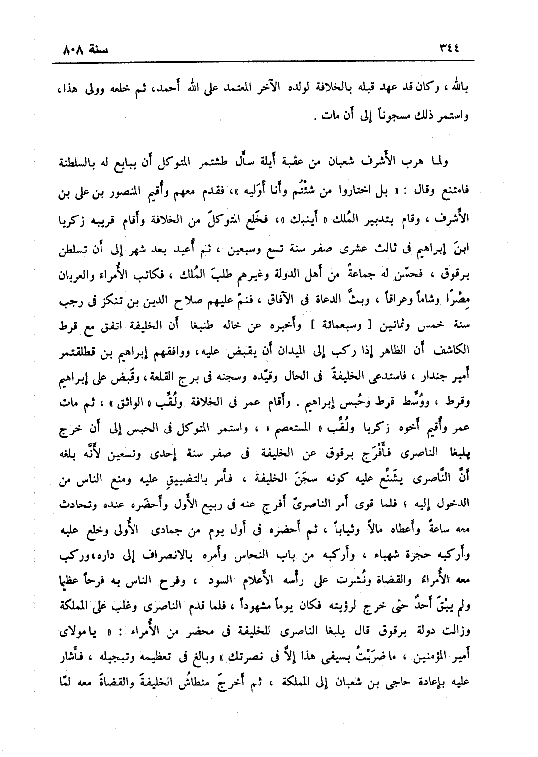بالله، وكان قد عهد قبله بالخلافة لولده الآخر المعتمد على الله أحمد ثم خلعه وولي هذا واستمر ذلك مسجوناً إلى أن مات، ولما هرب الأشرف شعبان من عقبة أيلة سأل طشتمر المتوكل أن يبايع له بالسلطنة فامتنع وقال: بل اختاروا من شئتم وأنا أولّيه، فقدم معهم وأقيم المنصور بن علي بن الأشرف، وقام بتدبير الملك إينبك فخلع المتوكل من الخلافة وأقيم قريبه زكريّا بن إبراهيم في ثالث عشري صفر سنة تسع وسبعين، ثم أعيد بعد شهر إلى أن تسلطن برقوق فحسن له جماعة من أهل الدولة وغيرهم طلب الملك فكاتب الأمراء والعربان مصراً وشاماً وعراقاً وبث الدعاة في الآفاق، فنمّ عليهم صلاح الدين بن تنكز في رجب سنة خمس وثمانين وأخبره عن حالة الطنبغا أن الخليفة اتفق مع قرط الكاشف أن الظاهر إذا ركب إلى الميدان قبض عليه ووافقهم إبراهيم بن طلقتمر أمير جندار، فاستدعى الخليفة في الحال وقيّده وسجنه في برج القلعة وقبض على إبراهيم وقرط فوسط قرط وحبس إبراهيم، وأقام عمر في الخلافة ولقب الواثق، ثم مات عمر وأقيم أخوه زكريّا ولقب المستعصم، واستمر المتوكل في الحبس إلى أن خرج يلبغا الناصري فأفرج برقوق عن الخليفة في صفر سنة إحدى وتسعين، لأنه بلغه أن الناصري يشنع عليه كونه سجن الخليفة فأمر بالتضييق عليه فمنع الناس من الدخول عليه، فلما قوي الناصري أفرج عنه في ربيع الأول وأحضره عنده وتحادث معه ساعة وأعطاه مالاً وثياباً، ثم أحضره في أول يوم من جمادى الأولى وخلع عليه وأركبه حجرة شهباء وأركبه من باب النحاس وأمره بالانصراف إلى داره، وركب معه الأمراء والقضاة، ونشرت على رأسه الأعلام السود، وفرح الناس به فرحاً عظيماً، ولم يبق أحد حتى خرج لرؤيته فكان يوماً مشهوداً، فلما قدم الناصري وغلب على المملكة وأزال دولة برقوق قال يلبغا الناصري للخليفة بمحضر من الأمراء يا مولانا أمير المؤمنين ما ضربت بسيفي هذا إلا في نصرتك، وبالغ في تعظيمه وتبجيله، فأشار عليه بإعادة حاجي بن شعبان إلى المملكة ثم أخرج منطاش الخليفة والقضاة معه لما