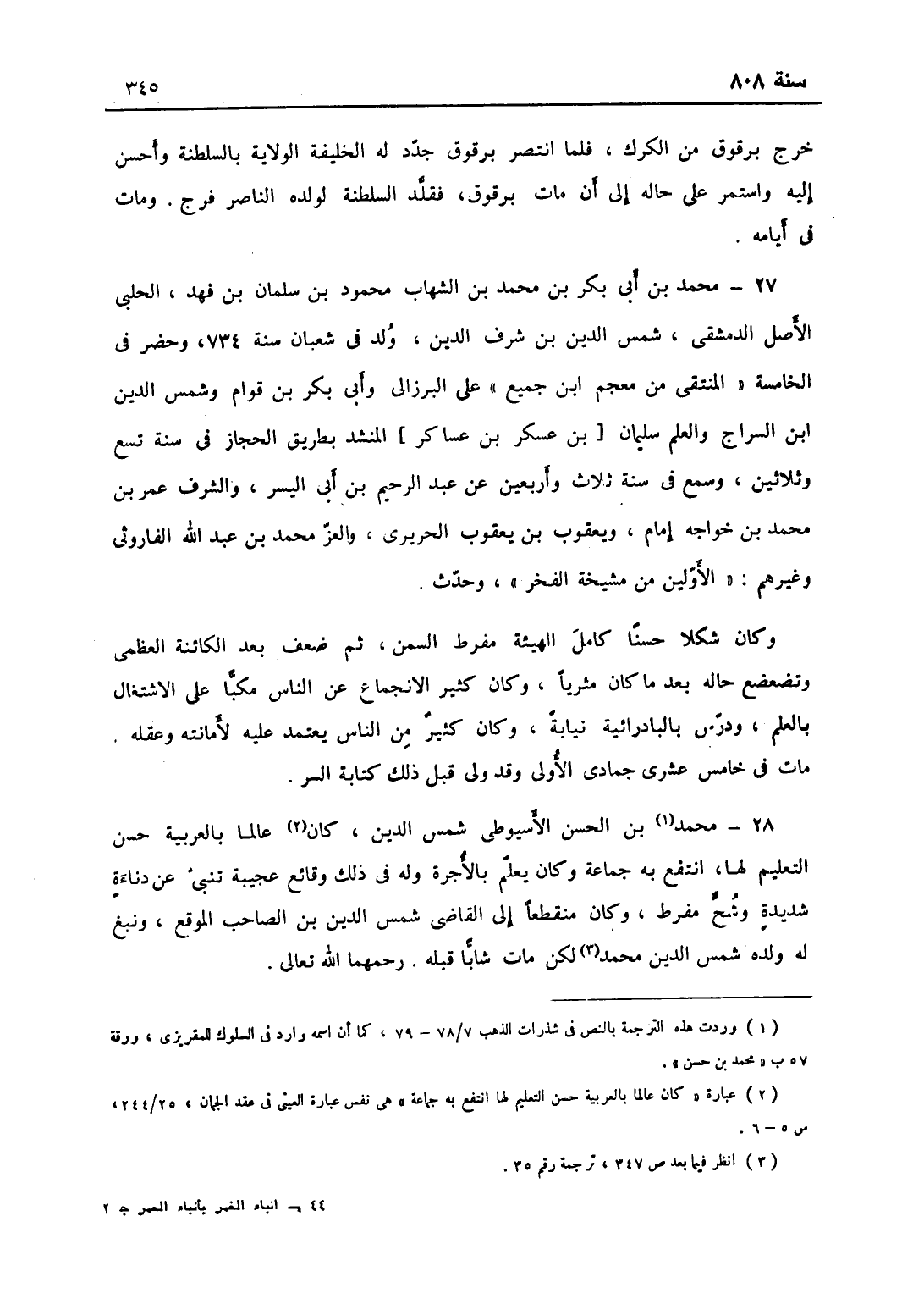 خرج برقوق من الكرك، فلما انتصر برقوق جدّد له الخليفة الولاية بالسلطنة وأحسن إليه، واستمر على حاله إلى أن مات برقوق فقلد السلطنة لولده الناصر فرج، ومات في أيامه محمّد بن أبي بكر بن محمّد بن الشهاب محمود بن سلمان بن فهد الحلبي الأصل الدمشقي شمس الدين بن شرف الدين ولد في شعبان سنة 734، وأحضر في الخامسة المنتقى من معجم ابن جميع علي البرزالي وأبي بكر بن قوام وشمس الدين ابن السراج والعلم سليمان المنشد بطريق الحجاز في سنة تسعً وثلاثين، وسمع في سنة ثلاث وأربعين من عبد الرحيم بن أبي اليسر والشرف عمر بن محمّد بن خواجا إمام ويعقوب بن يعقوب الحريري والعز محمّد بن عبد الله الفاروثي وغيرهم الأولين من مشيخة الفخر وحدث، وكان شكلاً حسناً كامل البنية مفرط السمن، ثم ضعف بعد الكائنة العظمى وتضعضع حاله بعد ما كان مثرياً، وكان كثير الانجماع عن الناس مكبّاً على الاشتغال بالعلم، درس بالبادرائية نيابة، وكان كثير من الناس يعتمد عليه لأمانته وعقله، مات في خامس عشري جمادى الأولى وله أربعٌ وسبعون سنة ونصف سنة، وكان أبوه موقع الدست بدمشق وقد ولي قبل ذلك كتابة السر.
