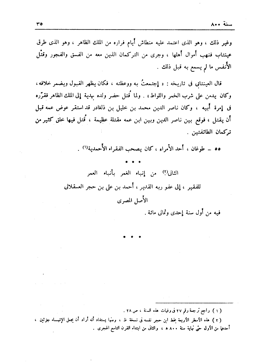 ن وغير ذلك وهو الذي اعتمد عليه منطاش أيام فراره من الملك الظاهر، وهو الذي طرق عينتاب فنهب أموال أهلها وجرى من التركمان الذين معه من الفسق والفجور وقتل الأنفس ما لم يسمع به قبل ذلك، قال العينتابي في تاريخه: اجتمعت به ووعظته فكان يظهر القبول ويضمر خلافه وكان يدمن على شرب الخمر واللواط، ولم قتل حضر ولده بهدية إلى الملك الظاهر فقرره في إمرة أبيه، وكان ناصر الدين محمد بن خليل بن دلغادر قد استقر عوض عنه قبل أن يقتل، فوقع بين ناصر الدين وبين ابن عمه مقتلة عظيمة قتل فيها خلق كثير من تركمان الطائفتين.