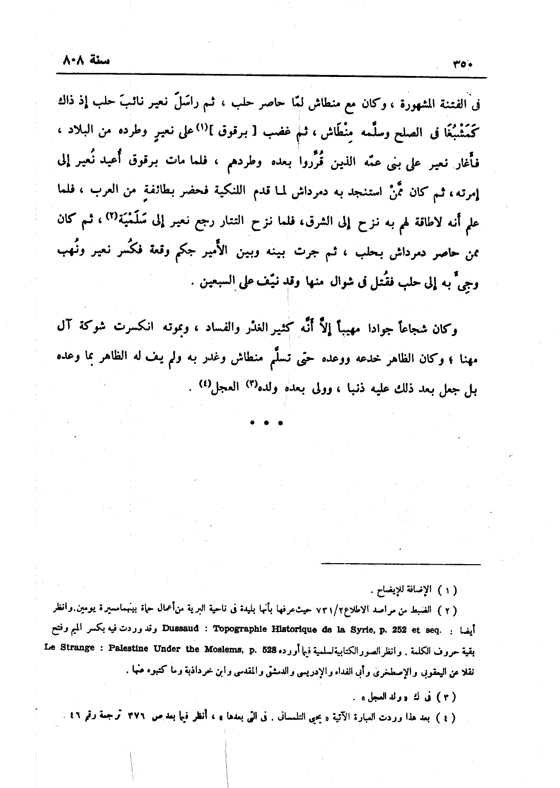 في الفتنة المشهورة وكان مع منطاش لما حاصر حلب ثم راسل نعير نائب حلب إذ ذاك كمشبغا في الصلح وتسلمه منطاش ثم غضب برقوق على نعير وطرده من البلاد فأغار نعير على بني عمّه الذين قرروا بعده وطردهم، فلما مات برقوق أعيد نعير إلى إمرته ثم كان ممن استنجد به دمرداش لما قدم اللنكية فحضر بطائفة من العرب فلما علم أنه لا طاقة لهم بهم نزح إلى الشرق، فلما نزح التتار رجع نعير إلى سلمية ثم كان ممن حاصر دمرداش بحلب ثم جرت بينه وبين الأمير جكم وقعة فكسر نعير ونهب وجيء به إلى حلب فقتل في شوال منها وقد نيف على السبعين، وكان شجاعاً جواداً مهاباً إلاّ أنه كثير الغدر والفساد وبموته انكسرت شوكة آل مهنّا وكان الظاهر خدعه ووعده حتى سلم منطاش وغدر به فلم يف له الظاهر بما وعده بل جعل يعد ذلك عليه ذنباً وولي بعده ولده العجل