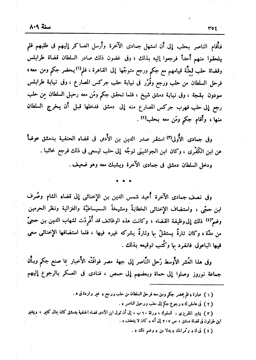 فأقام الناصر بحلب إلى أن استهل جمادى الآخرة، وأرسل العساكر في طلبهم فلم يلحقوا منهم أحداً، فرجعوا إليه بذلك، وفي غضون ذلك صادر السلطان قضاة طرابلس وقضاة حلب لعلة قيامهم مع جكم، ورجع متوجهاً إلى القاهرة وقرر في نيابة حلب جركس المصارع وفي نيابة طرابلس سودون بقجة وفي نيابة دمشق شيخ، فلما تحقق جكم ومن معه من رحيل السلطان من حلب رجع إلى حلب، فهرب جركس المصارع منه إلى دمشق فدخلها قبل أن يخرج السلطان منها وأقام جكم ومن معه بحلب، وفي جمادى الأولى استقر صدر الدين ابن الأدمي في قضاء الحنفية بدمشق عوضاً عن ابن الكفري، وكان ابن الجواشي توجه إلى حلب يسعى في ذلك فرجع خائباً، ودخل السلطان دمشق في جمادى الآخرة ويشبك معه وهو ضعيف.