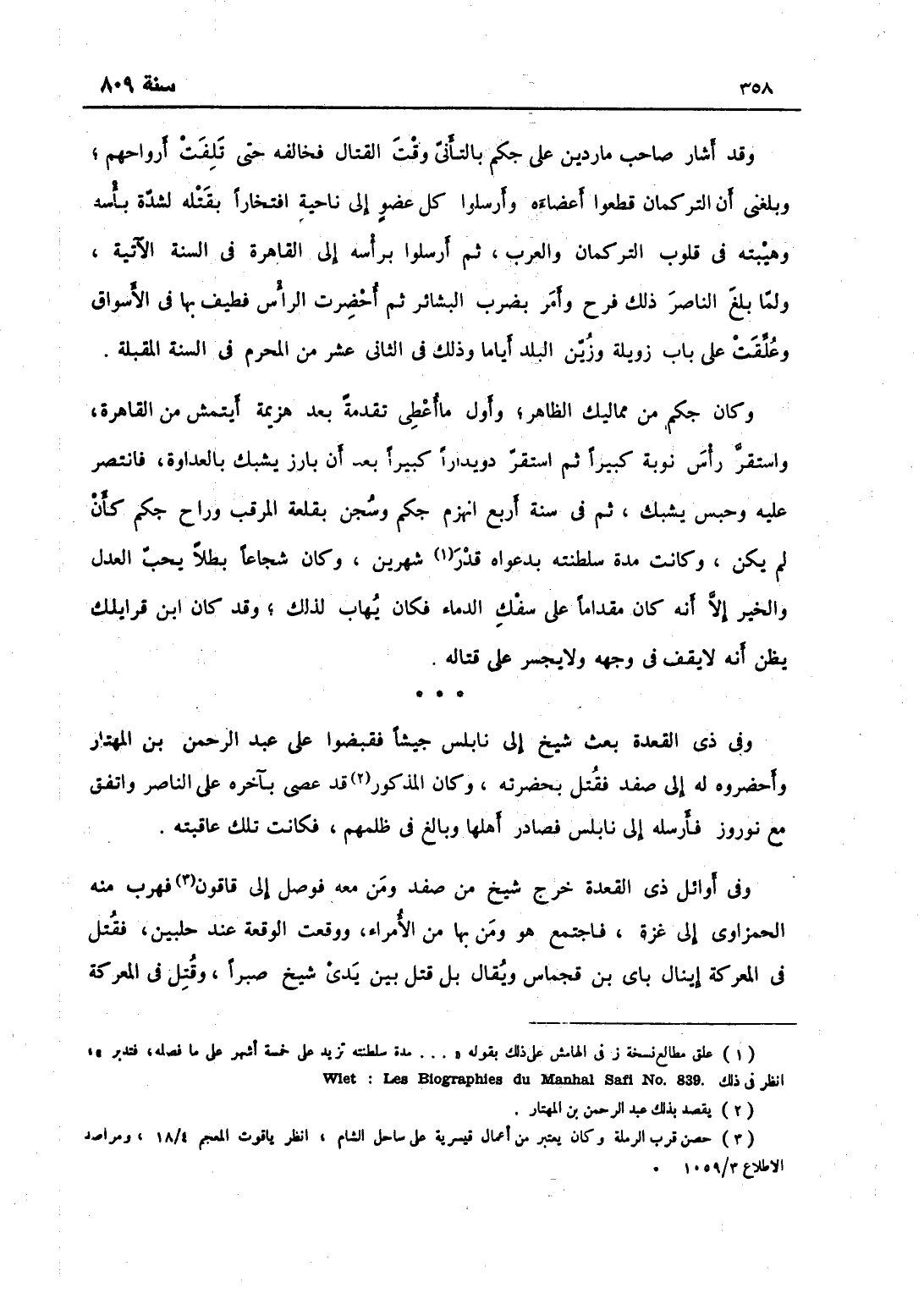 وقد أشار صاحب ماردين على جكم بالتأني وقت القتال، فخالفه حتى تلفت أرواحهم، وبلغني أن التركمان قطعوه أعضاء وأرسلوا كل عضو إلى ناحية افتخاراً بقتله لشدة بأسه وهيبته في قلوب التركمان والعرب، ثم أرسلوا برأسه إلى القاهرة في السنة الآتية، ولما بلغ الناصر ذلك فرح به وأمر بضرب البشائر، ثم أحضرت الرؤس فطيف بها في الأسواق وعلقت على باب زويلة وزينت البلد أياماً، وذلك في الثامن عشر من المحرم في السنة المقبلة وكان جكم من مماليك الظاهر وأول ما أعطي تقدمة بعد هزيمة أيتمش من القاهرة واستقر رأس نوبة كبيراً، ثم استقر دويداراً كبيراً بعد أن بارز يشبك بالعداوة فانتصر عليه وحبس يشبك، ثم في سنة أربع انهزم جكم وسجن بقلعة المرقب وراح جكم كأن لم يكن، فكانت مدة سلطنته بدعواه قدر شهرين، وكان شجاعاً بطلاً يحب العدل والخير إلا أنه كان مقداماً على سفك الدماء فكان يهاب لذلك، وقد كان ابن قرا يلك يظن أنه لا يقف في وجهه ولا يجسر على قتاله.