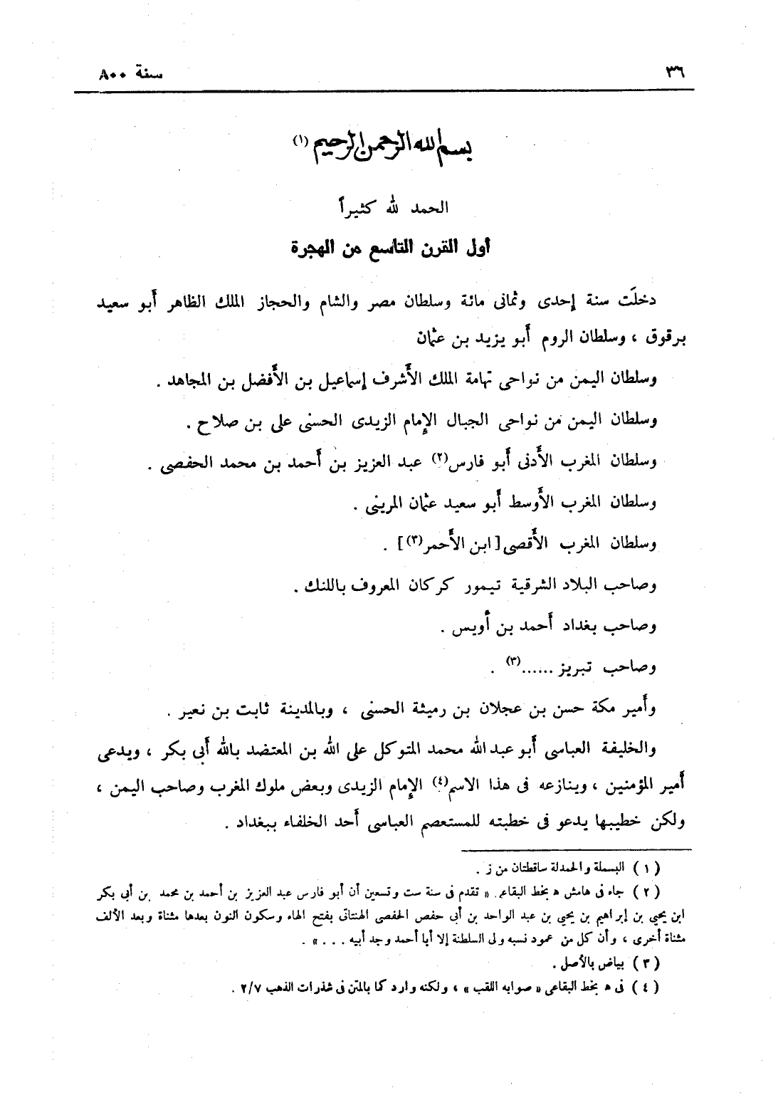 وسلطان مصر والشام والحجاز الملك الظاهر أبو سعيد برقوق، وسلطان الروم أبو يزيد بن عثمان، وسلطان اليمن من نواحي تهامة الملك الأشرف إسماعيل بن الأفضل بن المجاهد، وسلطان اليمن من نواحي الجبال الإمام الزيدي الحسني علي بن صلاح، وسلطان المغرب الأدنى أبو فارس عبد العزيز بن.... الحفصي، وسلطان المغرب الأوسط المريني، وسلطان المغرب الأقصى.......بن الأحمر، وصاحب البلاد الشرقية تيمور كوركان المعروف باللنك، وصاحب بغداد أحمد بن أويس، وصاحب تبريز.......، وأمير مكة حسن بن عجلان ابن رميثة الحسني، وأمير المدينة ثابت بن نعير، والخليفة العباسي أبو عبد الله محمد المتوكل على الله ابن المعتضد بالله أبي بكر ويدعى أمير المؤمنين ونازعه في هذا الأسم الإمام الزيدي وبعض ملوك المغرب وصاحب اليمن ولكن خطيبها يدعو في خطبته للمستعصم العباسي أحد الخلفاء ببغداد