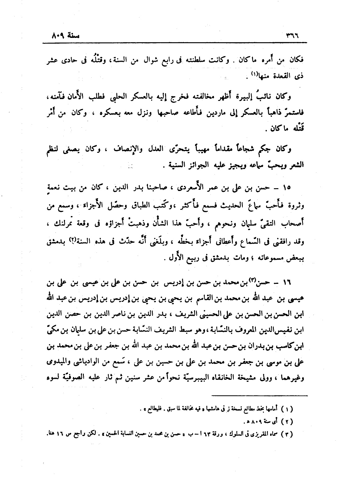 فكان من أمره ما كان، وكانت سلطنته في رابع شوال من السنة وقتله في حادي عشر ذي القعدة منها، وكان نائب البيرة أظهر مخالفته فخرج إليه بالعسكر الحلبي فطلب الأمان فأمنه، فاستمر ذاهباً بالعسكر إلى ماردين فأطاعه صاحبها ونزل بعسكره، وكان من أمر قتله ما كان، وكان جكم شجاعاً مقداماً مهاباً يتحرى العدل ويحب الإنصاف، وكان يصغي لنظم الشعر، ويحب سماعه، ويجيز عليه الجوائز السنية.