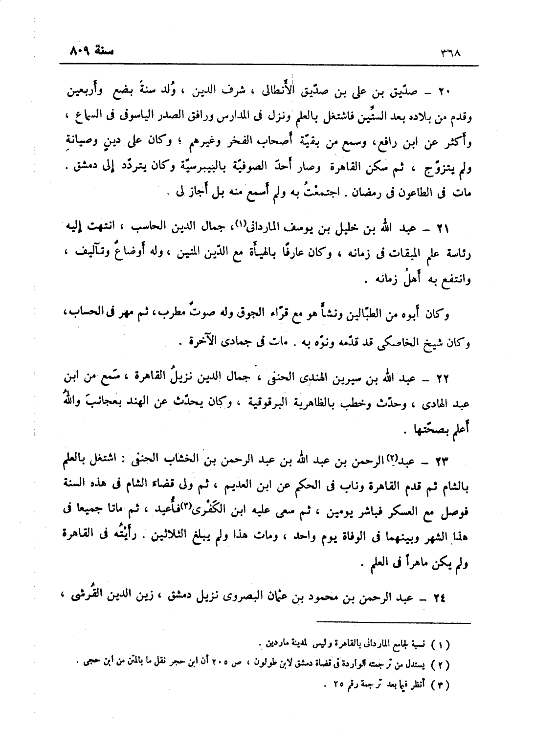 عبد الله بن خليل بن يوسف المارداني جمال الدين الحاسب انتهت إليه رياسة علم الميقات في زمانه وكان عارفاً بالهيئة مع الدين المتين وله أوضاع وتواليف وانتفع به أهل زمانه وكان أبوه من الطبالين ونشأ هو مع قراء الجوق وكان له صوت مطرب ثم مهر في الحساب وكان شيخ الخاصكي قد قدمه ونوه به مات في جمادى الآخرة.