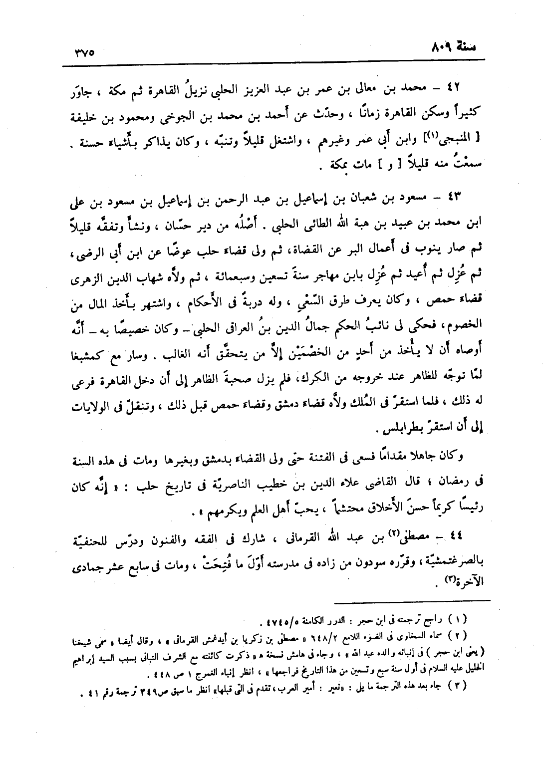 مسعود بن شعبان بن إسماعيل بن عبد الرحمن بن إسماعيل بن مسعود بن علي بن محمّد بن عبيد بن هبة الله الطّائيّ الحلبي، أصله من دير حسان ونشأ فتفقّه قليلا، ثم صار ينوب في أعمال البر عن القضاة، ثم ولي قضاء حلب عوضاً عن ابن أبي الرضى، ثم عزل ثم أعيد، ثم عزل بابن مهاجر سنة تسعين وسبعمائة، ثم ولاّه شهاب الدين الزهري قضاء حمص، وكان يعرف طرق السعي وله دربة في الأحكام، واشتهر بأخذ المال من الخصوم، فحكى لي نائب الحكم جمال الدين ابن العراقي الحلبي وكان خصيصاً به أنه أوصاه أن لا يأخذ من أحد الخصمين إلا لمن يتحقق أنه الغالب، وسار مع كمشبغا لما توجه للظاهر عند خروجه من الكرك، فلم يزل صحبة الظاهر إلى أن دخل القاهرة فرعى له ذلك، فلما استقرت قدمه في الملك ولاّه قضاء دمشق وقضاء حمص قبل ذلك وتنقل في الولايات إلى أن استقرّ بطرابلس، وكان جاهلاً مقداماً فسعى في الفتنة حتى ولي القضاء بدمشق وبغيرها، ومات في هذه السنة في رمضان، قال القاضي علاء الدين ابن خطيب الناصرية في تاريخ حلب: كان رئيساً كريماً حسن الأخلاق محتشماً، يحب أهل العلم ويكرمهم.