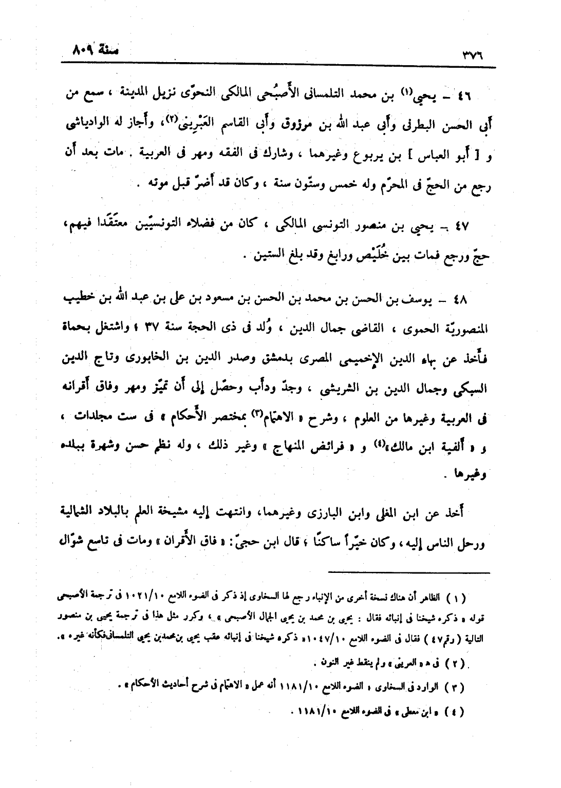 يحيى بن محمّد التلمساني الأصبحي المالكي النحوي نزيل المدينة، سمع من أبي الحسن البطرني وأبي عبد الله بن مرزوق وأبي القاسم العريني، وأجاز له الواد ياشي وابن يربوع وغيرهما، وشارك في الفقه ومهر في العربية، مات بعد أن رجع من الحج في المحرّم وله خمس وستون سنة، وكان قد أضر قبل موته.