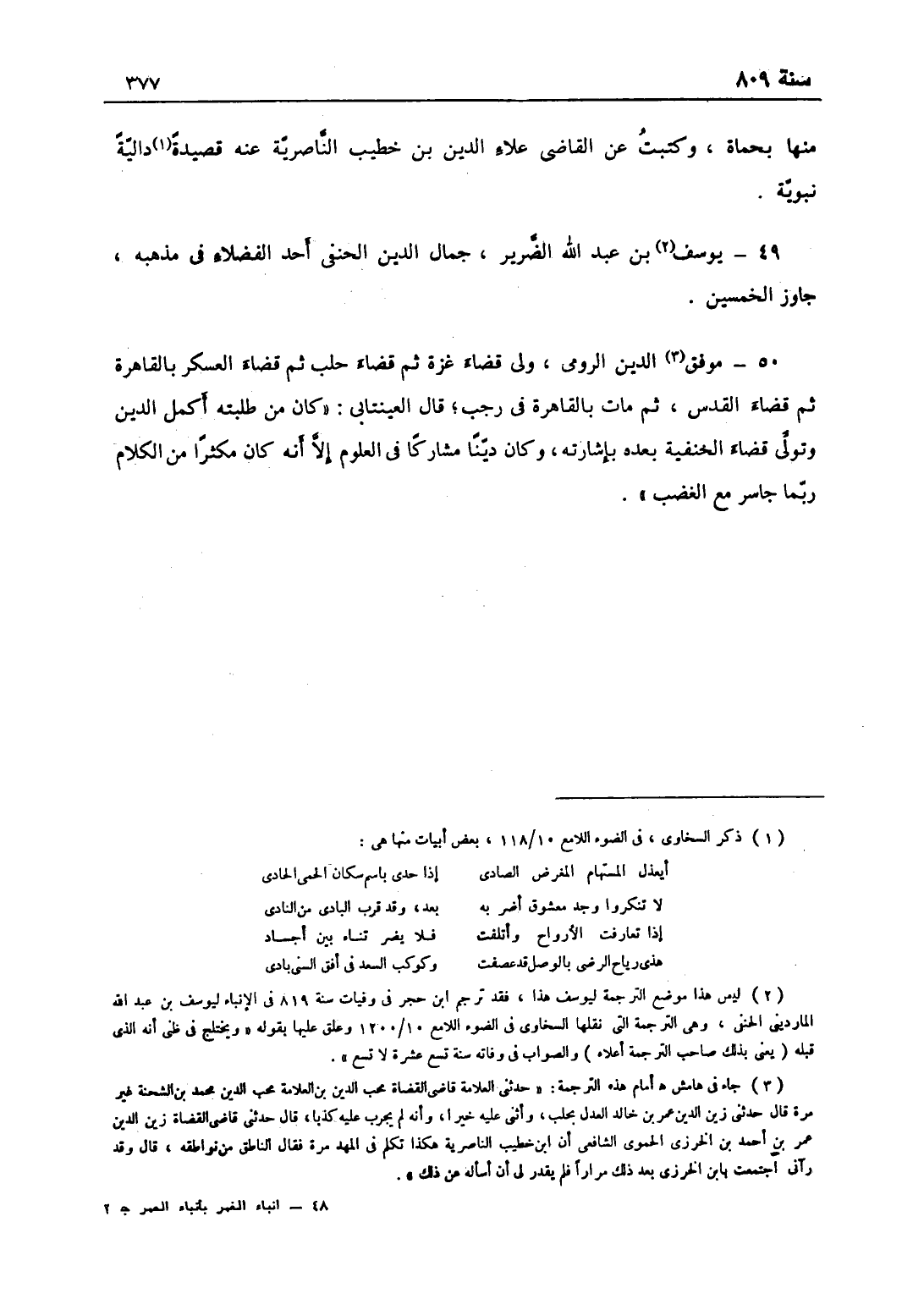 موفّق الدين الروميّ، ولي قضاء غزّة ثم قضاء حلب ثم قضاء العسكر بالقاهرة ثم قضاء القدس، ثم مات بالقاهرة في رجب، قال العينتابي: كان من طلبة أكمل الدين وتولّى قضاء الحنفيّة بعده بإشارته، وكان ديِّناً مشاركاً في العلوم إلا أنه كان مكثراً من الكلام لهّاجاً سريع الغضب.