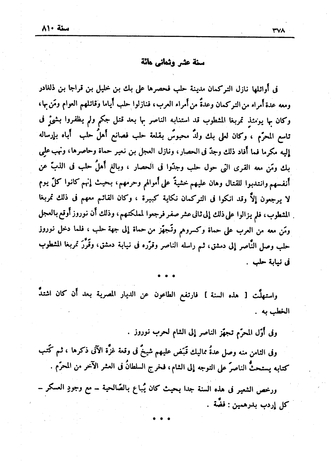 في أوائلها نازل التركمان مدينة حلب فحصرها علي بك بن خليل بن قراجا بن دلغادر ومعه عدة أمراء من التركمان وعدّة من أمراء العرب فنازلوا حلب أياماً وقاتلهم العوام ومن بها وكان بها يومئذ تمربغا المشطوب قد استنابه الناصر بها بعد قتل جكم فرحلوا ولم يظفروا بشيء في تاسع المحرم، وكان لعلي بك ولد محبوس بقلعة حلب فصانع أهل حلب أباه بإرساله إليه مكرّماً فما أفاد ذلك وجد في الحصار ونازل العجل ابن نعير حماة وحاصرها ونهب علي بك ومن معه القرى التي حول حلب وجدوا في الحصار، وبالغ أهل حلب في الذّبِّ عن أنفسهم وانتدبوا للقتال وهان عليهم الأمر خشية على أموالهم وحرمهم بحيث أنهم كانوا كل يوم لا يرجعون إلاّ وقد أنكوا في التركمان نكاية كبيرة، وكان القائم معهم في ذلك تمربغا المشطوب، فلم يزالوا على ذلك إلى ثاني عشر صفر فرجعوا لمملكتهم لما بلغهم أن نوروز أوقع بالعجل ومن معه من العرب على حماه وكسرهم وتجهز من حماه إلى جهة حلب، فلما دخل نوروز حلب وصل الناصر إلى دمشق، ثم راسله الناصر وقرره في نيابة دمشق وقرر تمربغا المشطوب في نيابة حلب واستهلت، فارتفع الطاعون من الديار المصرية بعد أن كان اشتدّ الخطب به.