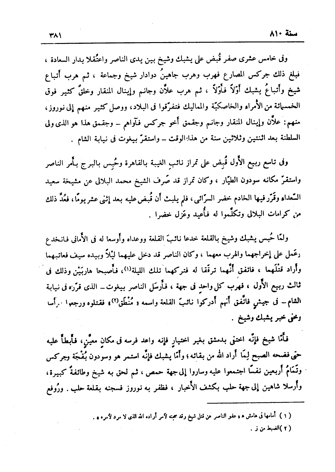 وفي خامس عشري صفر قبض على يشبك وشيخ بين يدي الناصر واعتقلا بدار السعادة، فبلغ ذلك جركس المصارع فهرب وهرب شاهين دوادار شيخ وجماعة، ثم هرب أتباع شيخ وأتباع يشبك أوّلاً فأوّلاً ثم هرب علان وجانم وأينال المنقار وخلق كثير فوق الخمسمائة من الأمراء والخاصكية والمماليك فتفرقوا في البلاد، ووصل كثير منهم إلى نوروز منهم علان وأينال المنقار وجانم وجقمق أخو جركس فآواهم، وجقمق هذا هو الذي ولي السلطنة بعد اثنتين وثلاثين سنة من هذا الوقت، واستقر بيغوت في نيابة الشام.