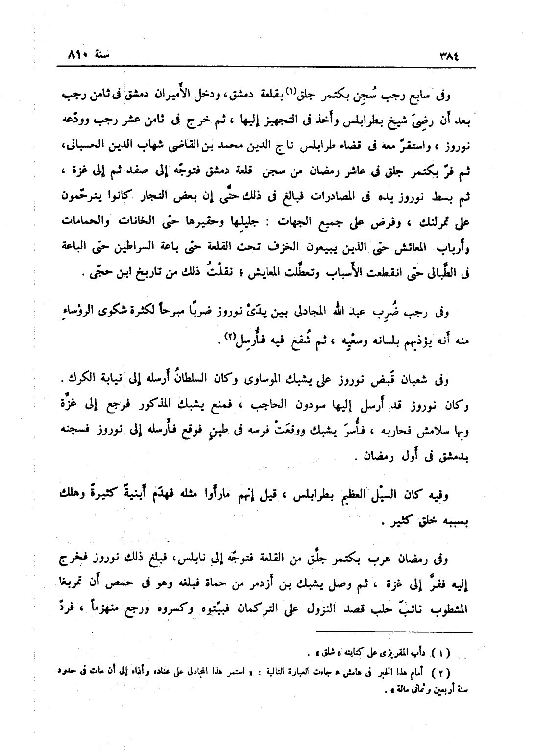 وفي سابع رجب سجن بكتمر جلق بقلعة دمشق، ودخل الأميران دمشق في ثامن رجب بعد أن رضي شيخ بطرابلس وأخذ في التجهيز إليها، ثم خرج في ثامن عشر رجب وودّعه نوروز، واستقر معه في قضاء طرابلس تاج الدين محمّد بن القاضي شهاب الدين الحسباني، ثم فرّ بكتمر جلق في عاشر رمضان من سجن قلعة دمشق، فتوجه إلى صفد ثم إلى غزة، ثم بسط نوروز يده في المصادرات فبالغ في ذلك حتى أن بعض التجار كانوا يترحّمون على تمرلنك، وفرض على جميع الجهات جليلها وحقيرها حتى الخانات والحمّامات وأرباب المعايش حتى الذين يبيعون الخزف تحت القلعة حتى باعة السراطين حتى الباعة في الطبالي حتى انقطعت الأسباب وتعطلت المعايش، نقلت ذلك من تاريخ ابن حجي.