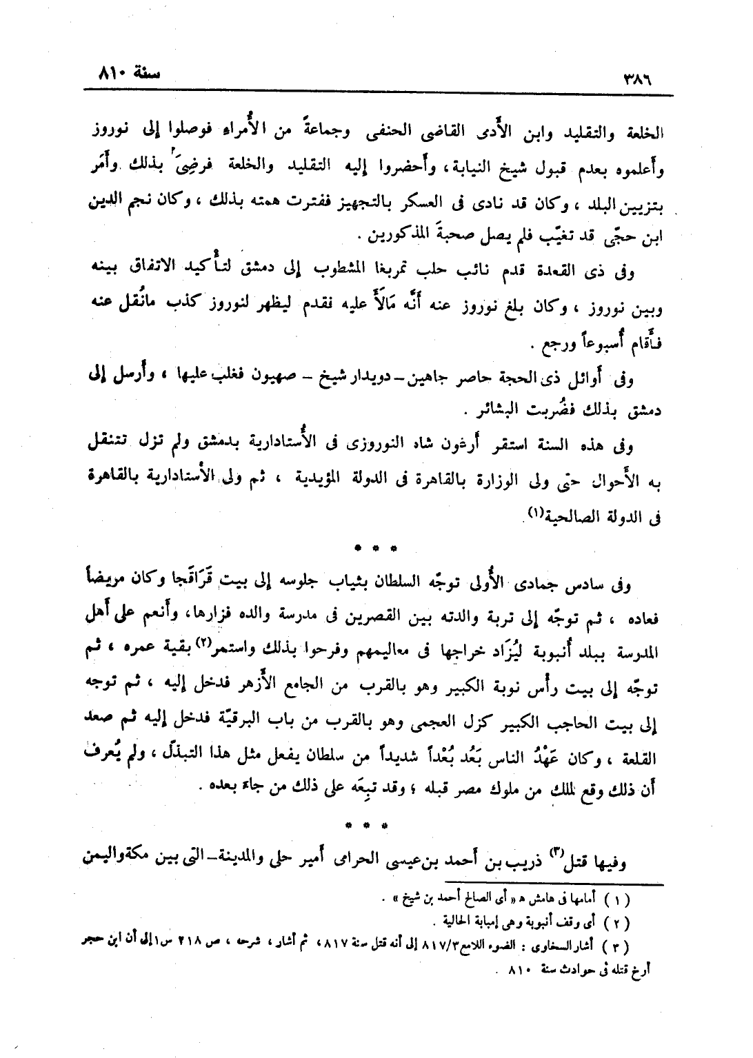الخلعة والتقليد وابن الأدمي القاضي الحنفي وجماعة من الأمراء، فوصلوا إلى نوروز وأعلموه بعدم قبول شيخ النيابة وأحضروا إليه التقليد والخلعة، فرضي بذلك وأمر بتزيين البلد، وكان قد نادى في العسكر بالتجهيز ففترت همته بذلك، وكان نجم الدين بن حجي قد تغيب فلم يصل صحبة المذكورين.