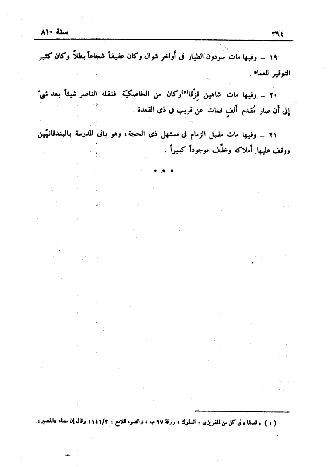 وفيها مات شاهين قزقا، وكان من الخاصكية، فنقله الناصر شيئاً بعد شيء إلى أن صار مقدم ألف، فمات عن قرب في ذي القعدة.