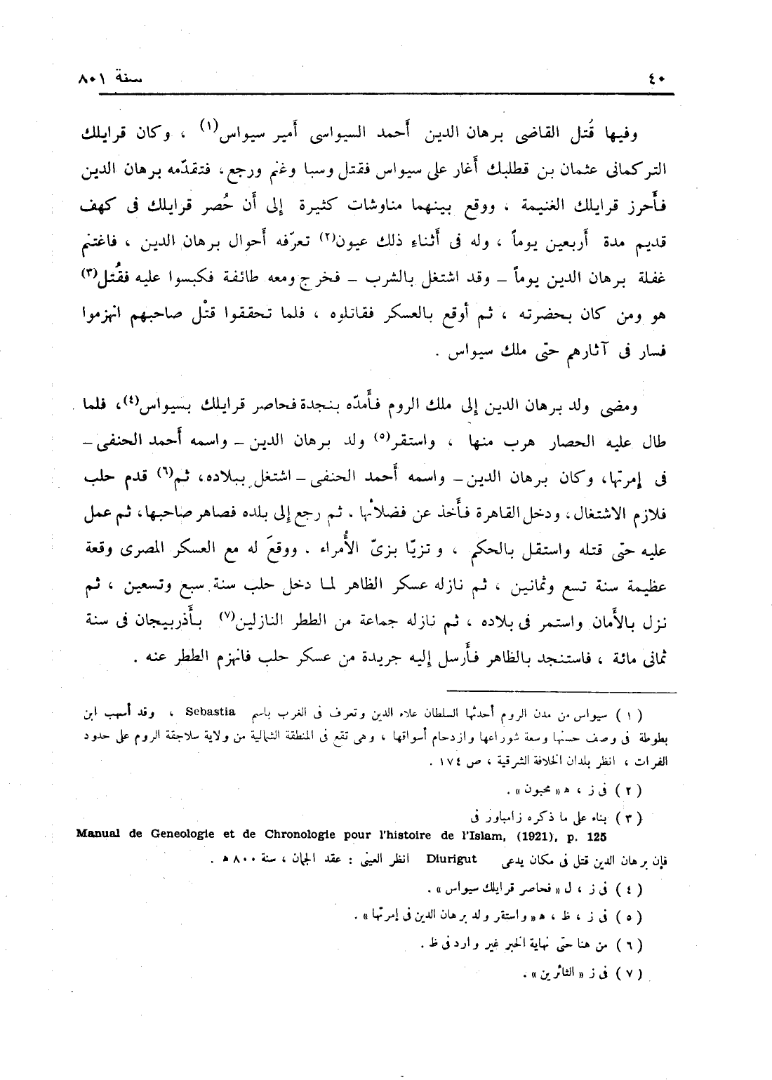 وفيها قتل القاضي برهان الدين أحمد بن عبد الله السيواسي أمير سيواس وكان قرايلك التركماني عثمان بن قطلبك أغار على سيواس فقتل وسبى وغنم ورجع فتقدمه برهان الدين فأحرز قرايلك الغنيمة ووقع بينهما مناوشات كثيرة إلى أن حصر قرايلك في كهف قديم نحو أربعين يوماً وله في أثناء ذلك عيون تعرفه أحوال برهان الدين فاغتنم غفلة برهان الدين يوماً وقد اشتغل بالشرب فخرج ومعه طائفة فكبسوا عليه فقتل هو ومن كان بحضرته، ثم أوقع بالعسكر فقاتلوه، فلما تحققوا قتل صاحبهم انهزموا، فسار في آثارهم حتى ملك سيواس، ومضى ولد برهان الدين إلى ملك الروم فأمده بنجدة فحاصر قرايلك بسيواس، فلما طال عليه الحصار هرب منها واستقر ولد برهان الدين في إمرتها، وكان برهان الدين السيواسي واسمه أحمد الحنفي اشتغل ببلاده ثم قدم حلب فلازم الاشتغال ودخل القاهرة فأخذ عن فضلائها، ثم رجع إلى بلده فصاهر صاحبها، ثم عمل عليه حتى قتله واستقل بالحكم وتزيا بزي الأمراء، ووقعت له مع العسكر المصري وقعة عظيمة في سنة تسع وثمانين، ثم نازله عسكر الظاهر لما دخل حلب سنة سبع وتسعين، ثم نزل بالأمان واستمر في بلاده، ثم نازله جماعة من الططر النازلين بآذربيجان في سنة ثمانمائة، فاستنجد بالظاهر فأرسل إليه جريدة من عسكر حلب فانهزم الططر عنه.
