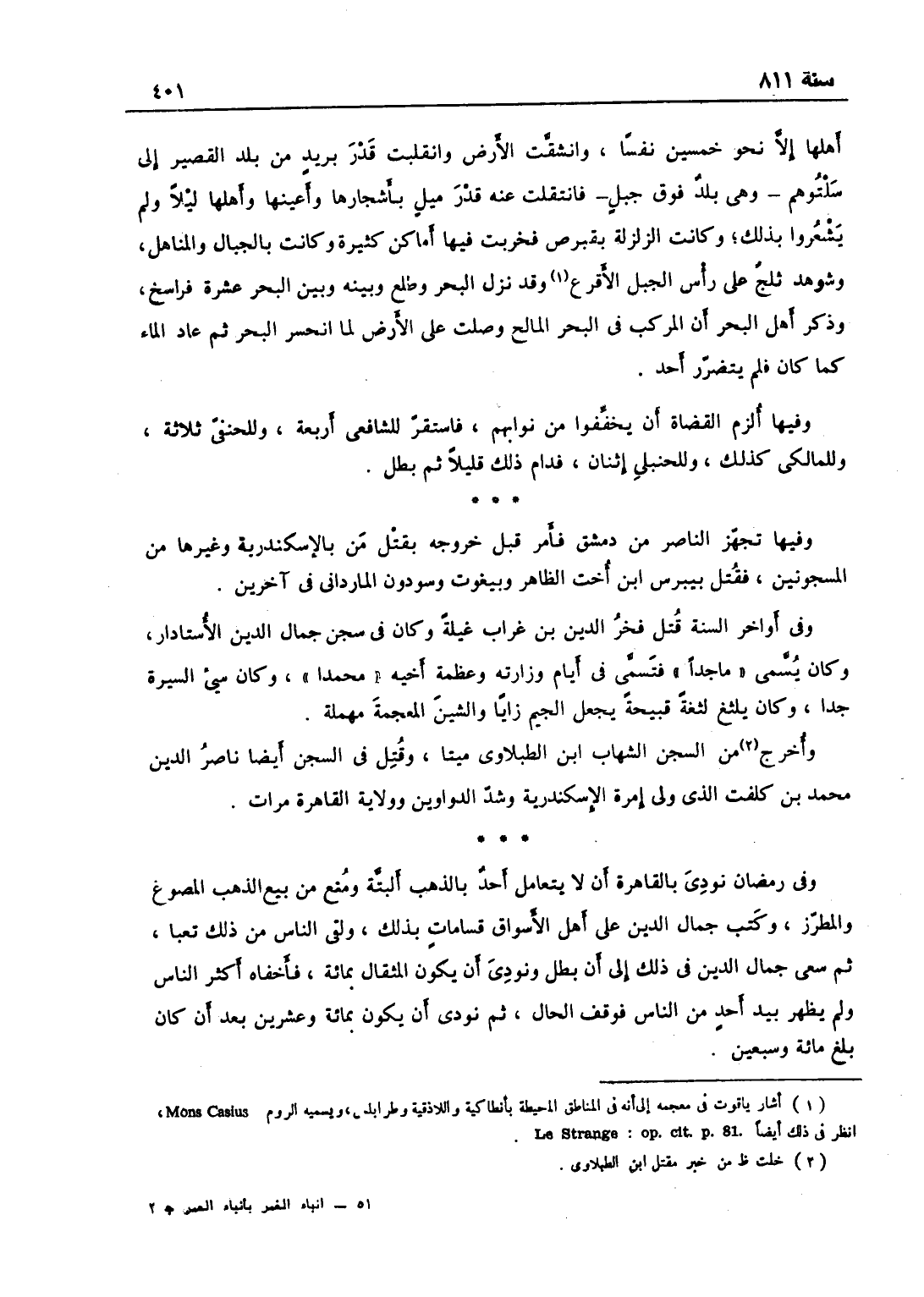 أهلها إلا نحو خمسين نفساً، وانشقت الأرض وانقلبت قدر بريد من القصير إلى سلقوهم، وهي بلد فوق جبل، فانتقلت عنه قدر ميل بأشجارها وأبنيتها وأهلها ليلاً ولم يشعروا بذلك، وكانت الزلزلة بقبرص، فخرب منها أماكن كثيرة، وكانت بالجبال والمناهل، وشوهد ثلج على رأس الجبل الأقرع، وقد نزل البحر وطلع وبينه وبين البحر عشرة فراسخ؛ وذكر أهل البحر أن المراكب في البحر الملح وصلت إلى الأرض لما انحسر البحر، ثم عاد الماء كما كان ولم يتضرر أحد.