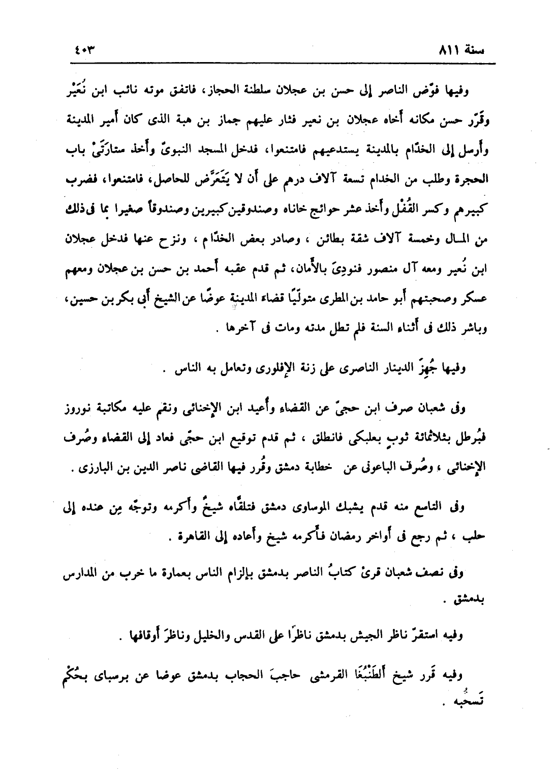 وفيها فوض الناصر إلى حسن بن عجلان سلطنة الحجاز، فاتفق موت ثابت بن نعير وقرر حسن مكانه أخاه عجلان بن نعير، فثار عليهم جماز بن هبة الدي وكان أمير المدينة وأرسل إلى الخدام بالمدينة يستدعيهم فامتنعوا، فدخل المسجد النبوي وأخذ ستارتي باب الحجرة وطلب من الخدام تسعة آلاف درهم على أن لا يتعرض للحاصل فامتنعوا، فضرب كبيرهم وكسر القفل وأخذ عشر حوايج خاناة وصندوقين كبيرين وصندوقاً صغيراً بما في ذلك من المال وخمسة آلاف شقة بطائق وصادر بعض الخدام ونزح عنها، فدخل عجلان بن نعير ومعه آل منصور فنودي بالأمان، ثم قدم عقبه أحمد بن حسن بن عجلان ومعه عسكر وصحبتهم أبو حامد بن المطري متولياً قضاء المدينة عوضاً عن الشيخ أبي بكر بن حسين وباشر في ذلك في أثناء السنة فلم تطل مدته ومات في آخرها؛ وفيها جهز الدينار الناصري على زنة الأفلوري وتعامل به الناس.