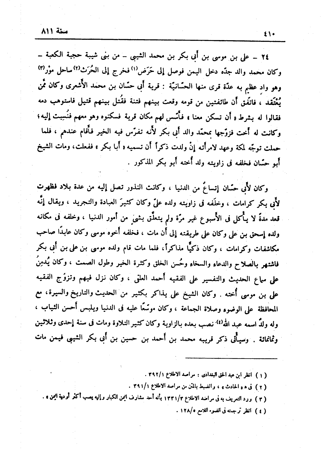 علي بن موسى بن أبي بكر بن محمّد الشيبي من بني شيبة حجبة الكعبة وكان محمّد والد جده دخل اليمن فوصل إلى حرض فخرج إلى الحارث ساحل مور وهو واد عظيم به عدة قرى منها الحسانية قرية أبي حسان بن محمّد الأشعري وكان ممن يعتقد فاتفق أن طائفتين من قومه وقعت بينهم فتنة فقتل بينهم قتيل فاستوهب دمه فقالوا له بشرط أن تسكن معنا فأسس لهم مكان قرية فسكنوه وهو معهم فنسب إليه وكانت له أخت فزوجها بمحمد والد أبي بكر لأنه تفرس فيه الخير فأقام عندهم فلما حملت توجه لمكة وعهد لامرأته إن ولدت ذكراً أن تسميه أبا بكر ففعلت فمات الشيخ أبو حسان فخلفه في زاويته ولد أخيه أبو بكر المذكور وكان لأبي حسان اتساع من الدنيا وكانت النذور تصل إليه من عدة بلاد فظهرت لأبي بكر كرامات وخلفه في زاويته ولده علي كان كثير العبادة والتجريد ويقال إنه قعد مدة لا يأكل في الأسبوع غير مرة ولم يتعلق بشيء من أمور الدنيا وخلفه في مكانه ولده إسحاق بن علي وكان على طريقته إلى أن مات، فخلفه أخوه موسى وكان عابداً صاحب مكاشفات وكرامات وكان ذكياً مذاكراً، فلما مات قدم ولده موسى ابن علي بن أبي بكر، فاشتهر بالصلاح والذكاء والسخاء وحسن الخلق وكثرة الخير وطول الصمت، وكان يدمن على سماع الحديث والتفسير على الفقيه أحمد العلقي، وكان نزل فيهم وتزوج الفقيه علي بن موسى أخته، وكان الشيخ علي يذاكر بكثير من الحديث والتاريخ والسيرة مع المحافظة على الوضوء وصلاة الجماعة، وكان موسعاً عليه في الدنيا ويلبس أحسن الثياب، وله ولد اسمه عبد الله نصب بعده بالزاوية، وكان كثير التلاوة، ومات في سنة إحدى وثلاثين وثمانمائة، وسيأتي ذكر قريبه محمّد بن أحمد بن حسين بن أبي بكر الشيبي فيمن مات