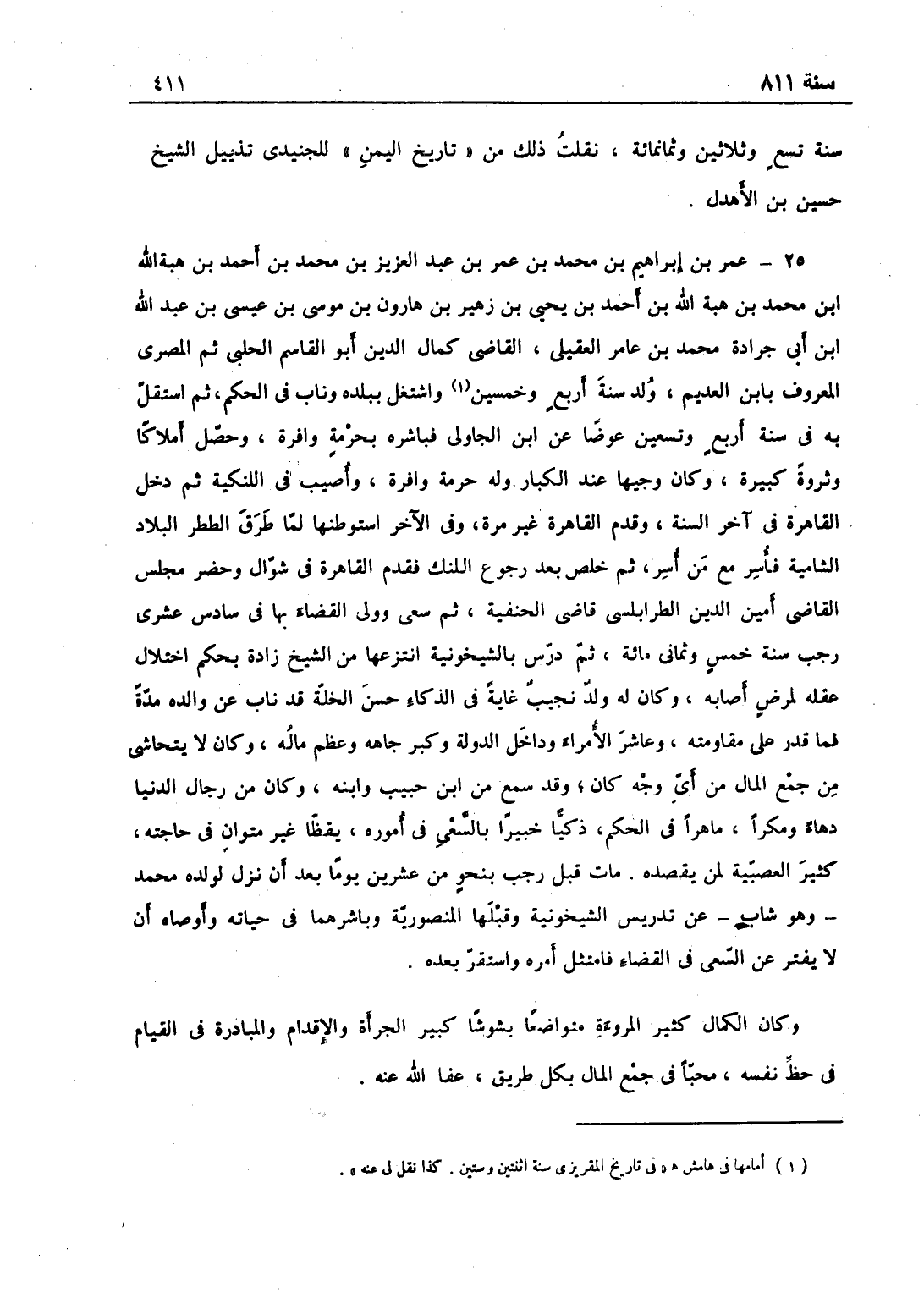 عمر بن إبراهيم بن محمّد بن عمر بن عبد العزيز بن محمّد بن أحمد بن هبة الله بن أحمد بن هبة الله بن أحمد بن يحيى بن زهير بن هارون بن موسى بن عيسى بن عبد الله بن أبي جرادة محمّد بن عامر العقيلي القاضي كمال الدين أبو القاسم الحلبي ثم المصري المعروف بابن العديم، ولد سنة أربع وخمسين واشتغل ببلده، وناب في الحكم ثم استقل به في سنة أربع وتسعين عوضاً عن ابن الجاولي، فباشره بحرمة وافرة وحصل أملاكاً وثروة كبيرة، وكان وجيهاً عند الكبار وله حرمة وافرة، وأصيب في اللنكية ثم دخل القاهرة في آخر السنة، وقدم القاهرة غير مرة وفي الآخر استوطنها لما طرق الططر البلاد الشامية، فأسر مع من أسر ثم تخلص بعد رجوع اللنك فقدم القاهرة في شوال، وحضر مجلس القاضي أمين الدين الطرابلسي قاضي الحنفية، ثم سعى وولي القضاء بها في سادس عشري شهر رجب سنة خمس وثمانمائة، ثم درس بالشيخونية انتزعها من الشيخ زاده بحكم اختلال عقله لمرض أصابه، وكان له ولد نجيب غاية في الذكاء حسن الخلة قد ناب عن والده مدة فما قدر على مقاومته، وعاشر الأمراء وأهل الدولة وكبر جاهه وعظم ماله وكان لا يتحاشى من جمع المال من أي وجه كان، وقد سمع من ابن حبيب وأبيه، وكان من رجال الدنيا دهاءً ومكراً ماهراً في الحكم ذكياً خبيراً بالسعي في أموره يقظاً غير متوان في حاجته كثير العصبية لمن يقصده مات قبل رجب بنحو عشرين يوماً بعد أن نزل لولده محمّد وهو شاب عن تدريس الشيخونية وقبلها المنصورية وباشرهما في حياته، وأوصاه أن لا يفتر عن السعي في القضاء فامتثل أمره واستقر بعده، وكان الكمال كثير المروءة متواضعاً بشوشاً كثير الجرأة والإقدام والمبادرة في القيام في حظ نفسه، محباً في جمع المال بكل طريق عفا الله عنه.