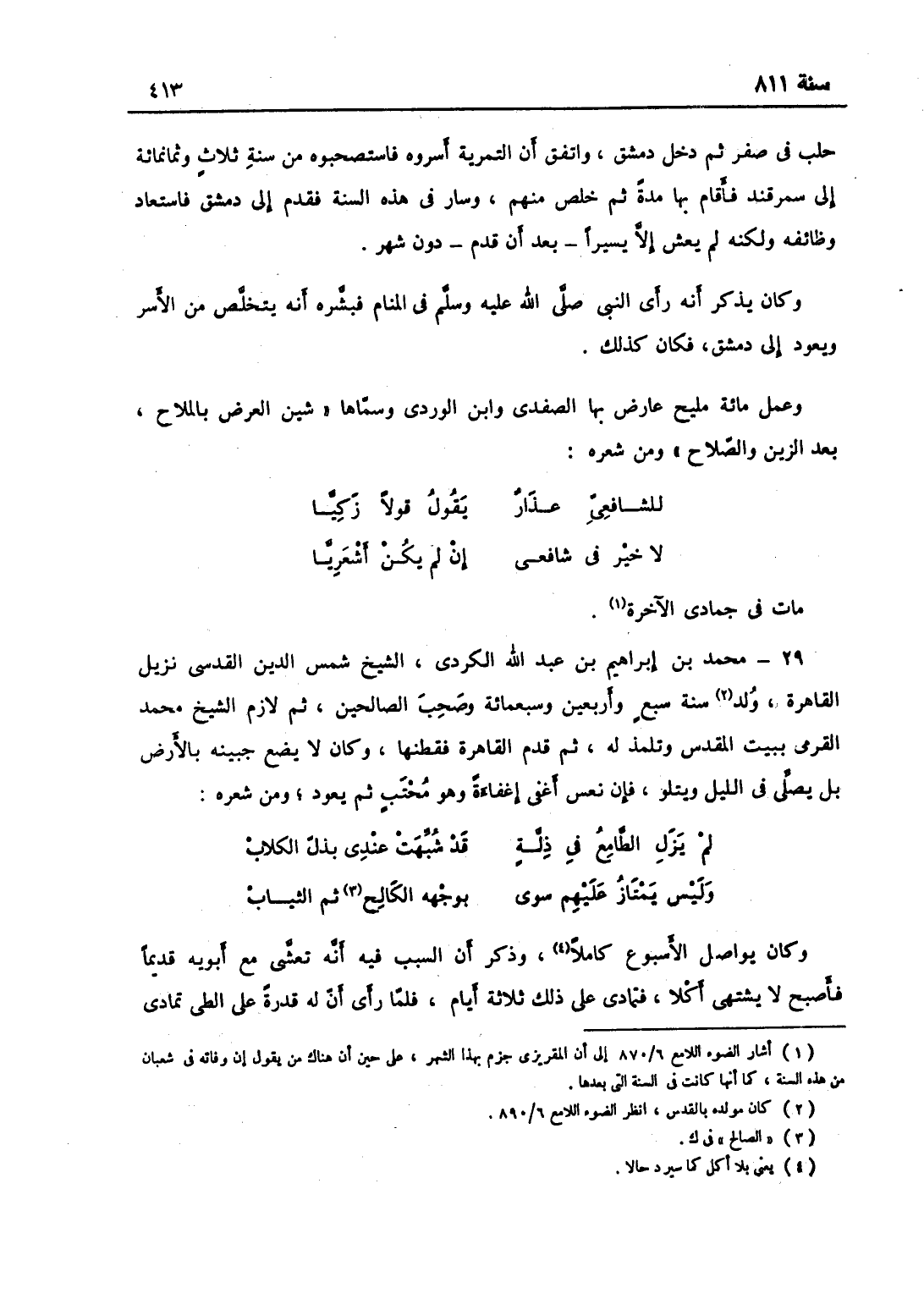 حلب في صفر ثم دخل دمشق واتفق أن التمرية أسروه فاستصحبوه في سنة ثلاث وثمانمائة إلى سمرقند فأقام بها مدة ثم خلص منهم وسافر في هذه السنة فقدم إلى دمشق فاستعاد وظائفه ولكن لم يعش إلا يسيراً بعد أن قدم بدون شهر وكان يذكر أنه رأى النبي صلّى الله عليه وسلّم في المنام فبشره أنه يتخلص من الأسر ويعود إلى دمشق فكان كذلك وعمل مائة مليح عارض بها الصلاح الصفدي وابن الوردي وسماها شين العرض بالملاح بعد الزين والصلاح، ومن شعره في مليح شافعي: