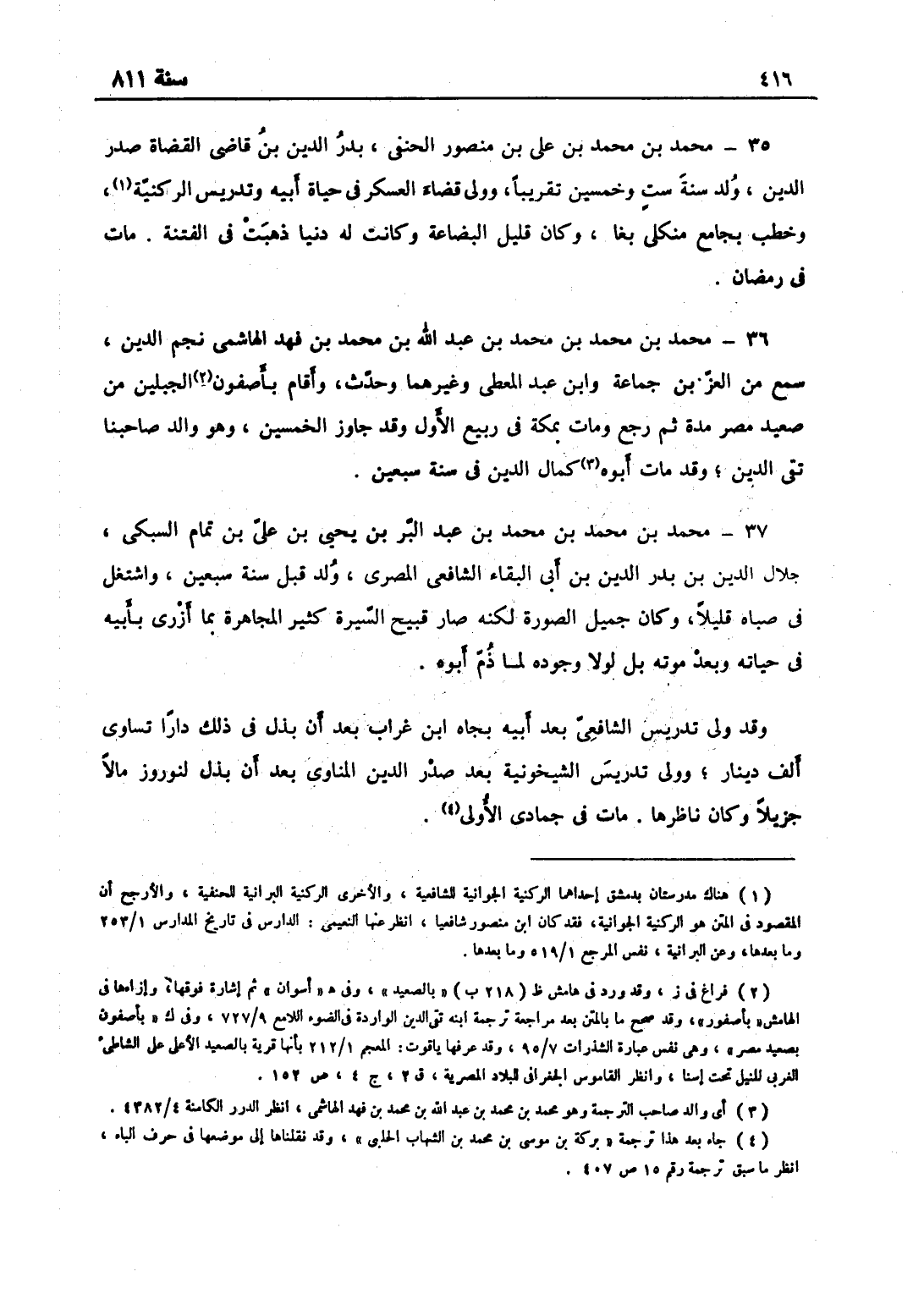 محمّد بن محمّد بن محمّد بن عبد البر بن يحيى بن علي بن تمام السبكي جلال الدين ابن بدر الدين بن أبي البقاء الشافعي المصري، ولد قبل سنة سبعين، واشتغل في صباه قليلاً، وكان جميل الصورة لكنه صار قبيح السيرة كثير المجاهرة بما أزرى بأبيه في حياته وبعد موته بل لولا وجوده لما ذمّ أبوه، وقد ولي تدريس الشافعي بعد أبيه بجاه ابن غراب بعد أن بذل في ذلك داراً تساوي ألف دينار، وولي تدريس الشيخونية بعد صدر الدين المناوي بعد أن بذل لنوروز مالاً جزيلاً وكان ناظرها، مات في جمادى الأولى.