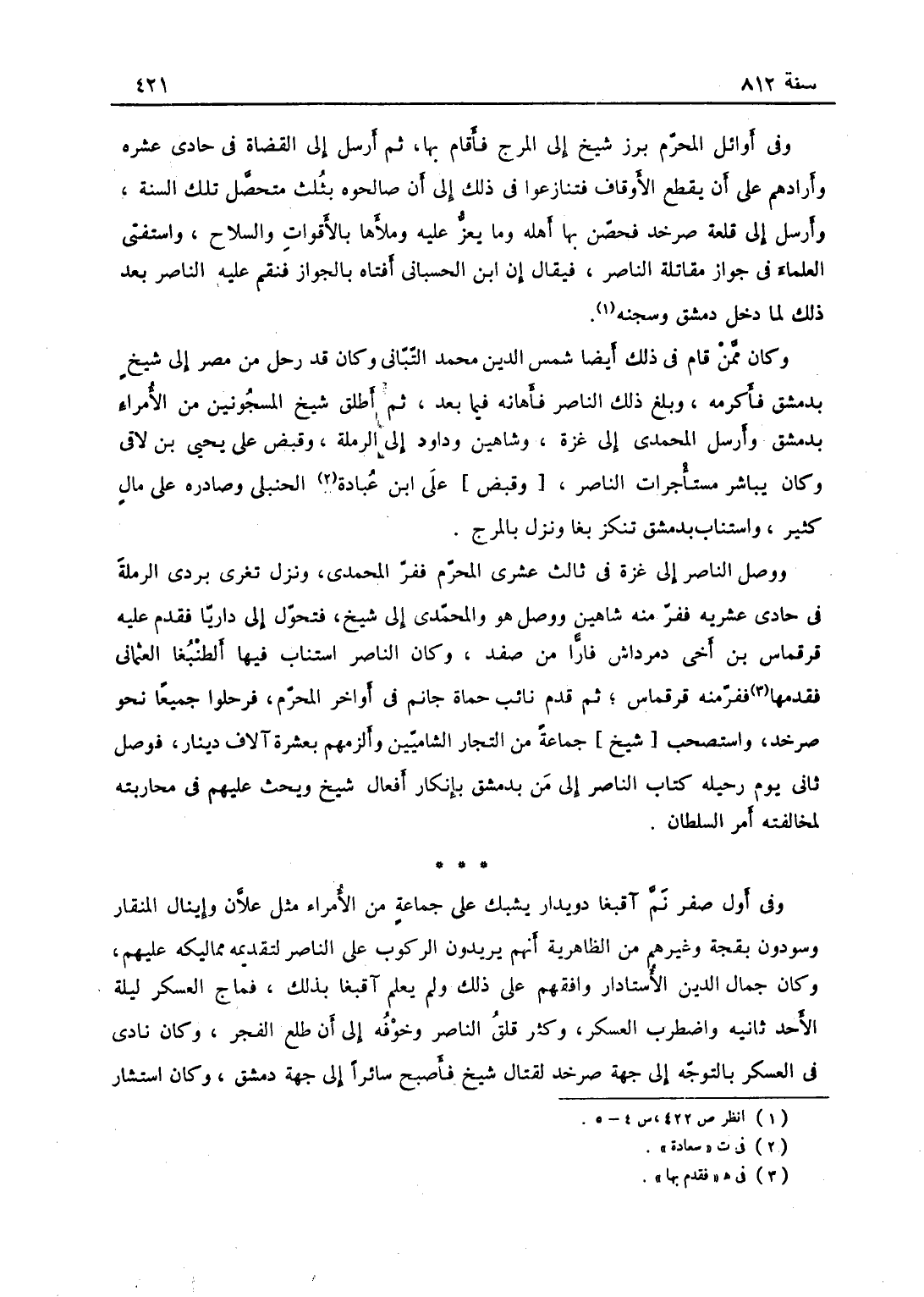 وفي أوائل المحرم برز شيخ إلى المرج فأقام بها ثم أرسل إلى القضاة في حادي عشره وأرادهم على أن تقطع الأوقاف، فتنازعوا في ذلك إلى أن صالحوه بثلث متحصل تلك السنة، وأرسل إلى قلعة صرخد فحصن بها أهله وما يعز عليه وملأها بالأقوات والسلاح، واستفتى العلماء في جواز مقاتلة الناصر، فيقال إن ابن الحسباني أفتاه بالجواز، فنقم عليه الناصر بعد ذلك لما دخل دمشق وسجن، وكان ممن قام في ذلك أيضاً شمس الدين محمّد التباني وكان قد رحل من مصر إلى شيخ بدمشق فأكرمه وبلغ ذلك الناصر فأهانه فيما بعد، ثم أطلق شيخ المسجونين من الأمراء بدمشق وأرسل سودون المحمدي إلى غزة وشاهين دواداره إلى الرملة وقبض على يحيى بن لاقي، وكان يباشر مستأجرات الناصر وعلى ابن عبادة الحنبلي وصادره على مال كثير واستناب بدمشق تنكز بغا ونزل بالمرج إلى جهة زرع ووصل الناصر إلى غزة في ثالث عشري المحرم، ففر المحمدي ونزل تغرى بردى الرملة في حادي عشريه ففر منه شاهين ووصل هو والمحمدي إلى شيخ فتحول إلى داريا، فقدم عليه قرقماش ابن أخي دمرداش فاراً من صفد وكان الناصر استناب فيها الطنبغا العثماني فقدم بها ففر منه قرقماش ثم قدم نائب حماة جانم في أواخر المحرم فرحلوا جميعاً نحو صرخد، واستصحب جماعة من التجار الشاميين وألزمهم بعشرة آلاف دينار فوصل ثاني يوم رحيله كتاب الناصر إلى من بدمشق بإنكار أفعال شيخ ويحث عليهم في محاربته لمخالفة أمر السلطان.
