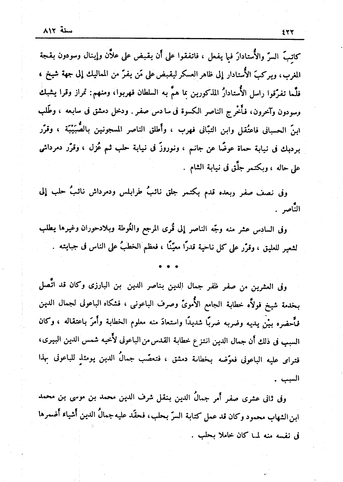 كاتب السر والأستادار فيما يفعل فاتفقوا على أنه يقبض على علان وإينال وسودون بقجة المغرب ويركب الأستادار إلى ظاهر العسكر ليقبض على من يفر من المماليك إلى جهة شيخ، فلما تفرقوا راسل الأستادار المذكورين بما هم به السلطان فهربوا، ومنهم تمراز وقرا يشبك وسودون الحمصي وآخرون، فنزل الناصر الكسوة في سادس صفر ودخل دمشق في سابعه وطلب ابن الحسباني فاعتقل وابن التباني فهرب، وأطلق الناصر المسجونين بالصبيبة، وقرر بردبك في نيابة حماة عوضاً عن جانم ونوروز في نيابة حلب، ثم عزل وقرر دمرداش على حاله وبكتمر جلق في نيابة الشام.