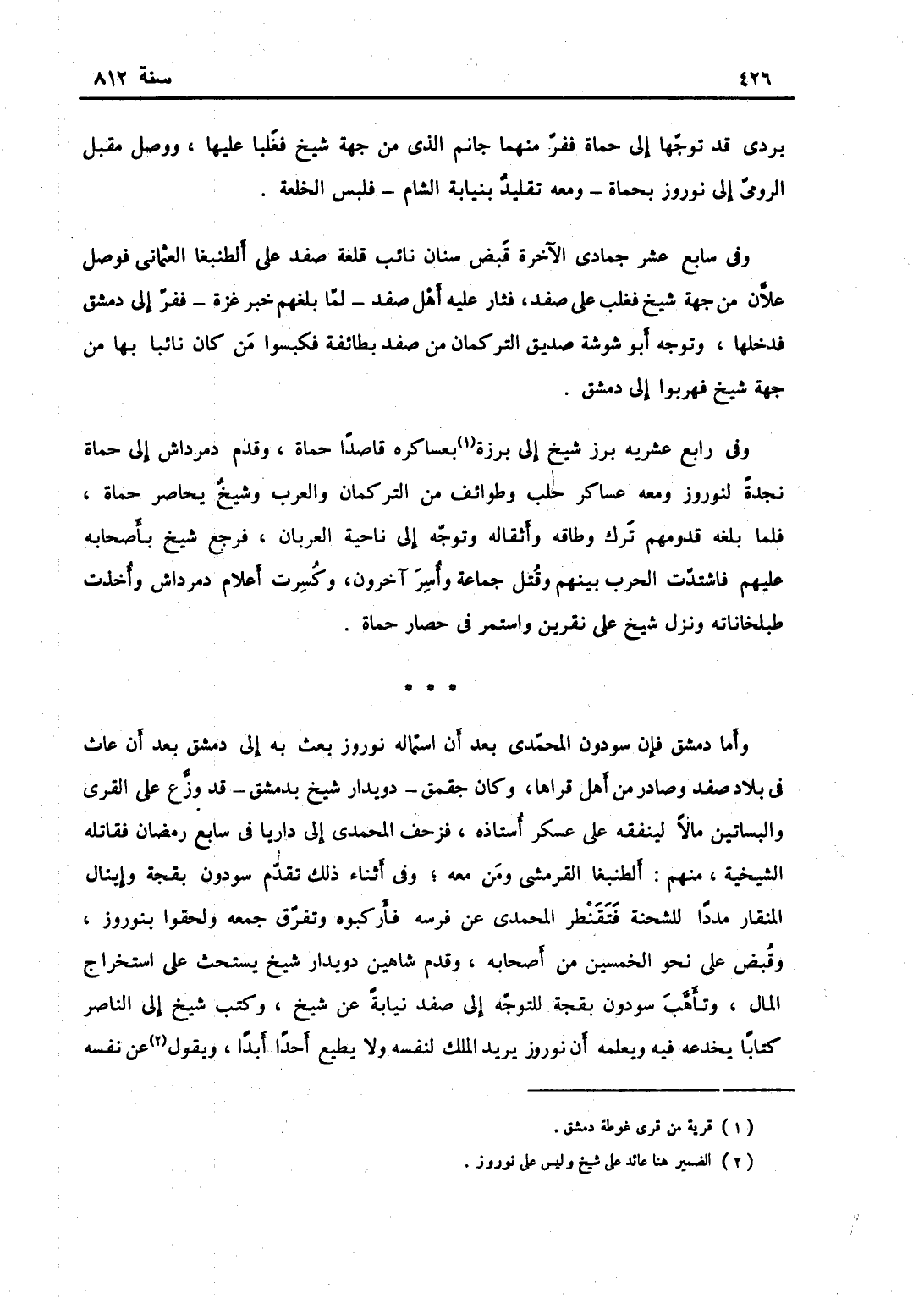 وفي رابع عشريه برز شيخ برزة بعساكره قاصداً حماة وقدم دمرداش إلى حماة لنجدة نوروز ومعه عساكر حلب وطوائف من التركمان ومن العرب وشيخ يحاصر حماة، فلما بلغه قدومهم ترك وطاقه وأثقاله، وتوجه إلى ناحية العربان، فركب دمرداش فأخذ الوطاق واشتغل أصحابه بالنهب فرجع شيخ بأصحابه عليهم، فاشتدت الحرب بينهم فقتل جماعة وأسر آخرون وكسرت أعلام دمرداش وأخذت طبلخاناته، ونزل شيخ على بعيرن واستمر في حصار حماة.